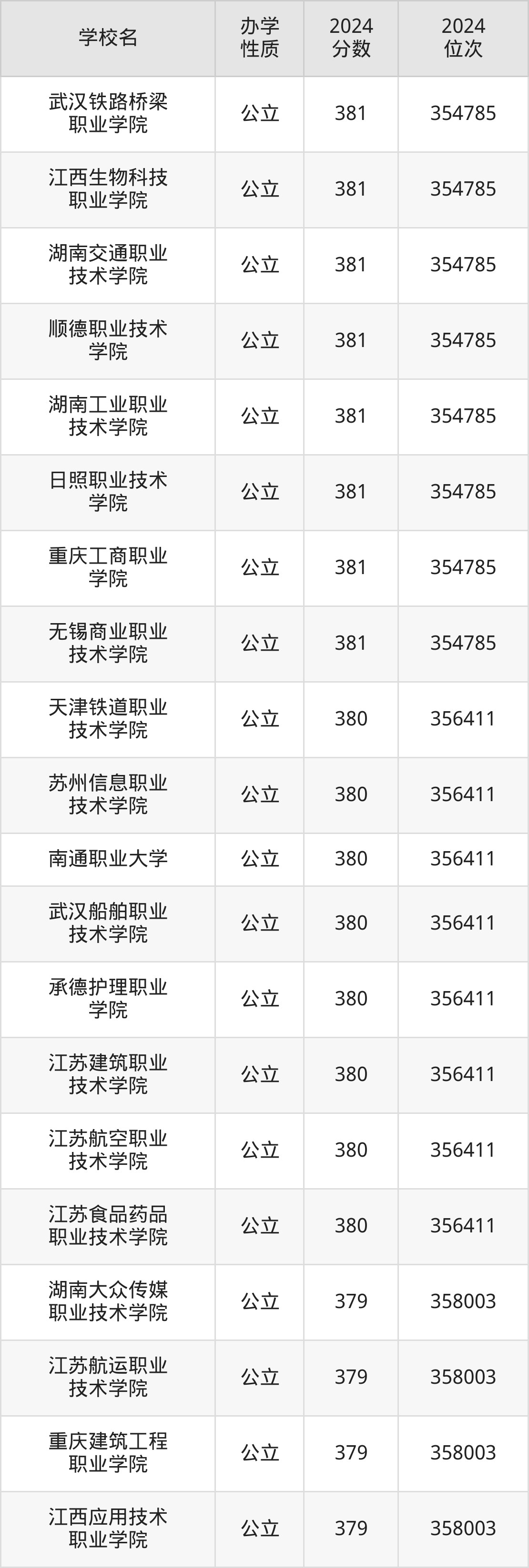 | 江苏航运职业 技术学院 | 379 | 358003 |