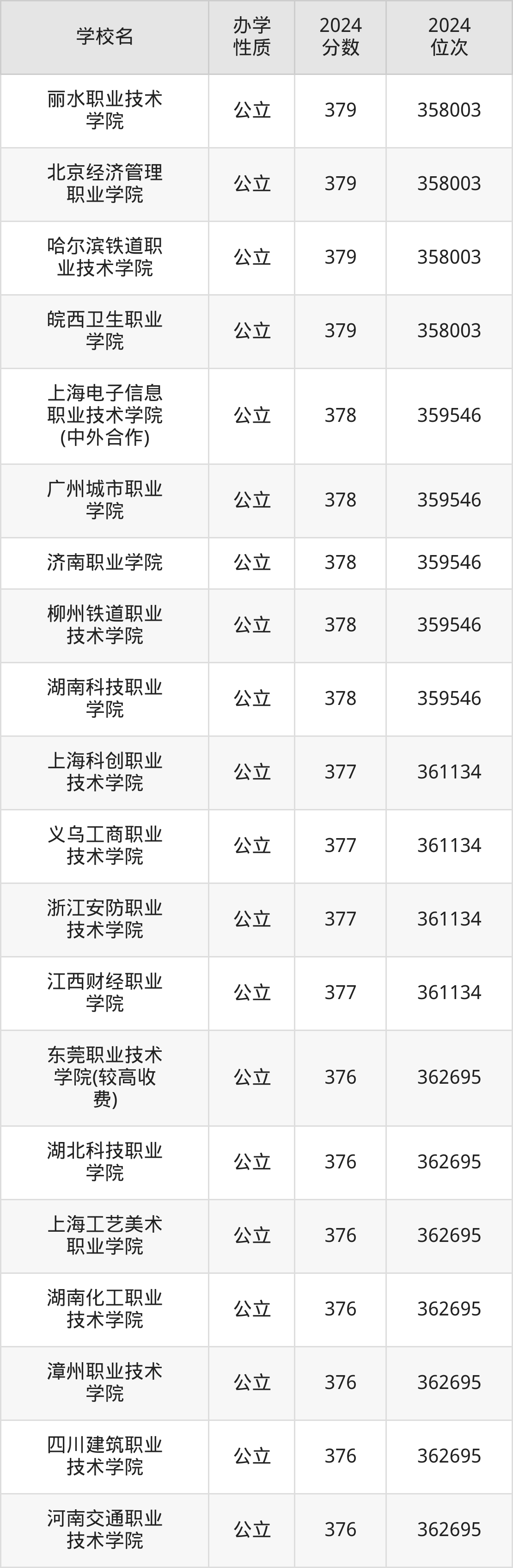 | 东莞职业技术 学院(较高收 费) | 376 | 362695 |