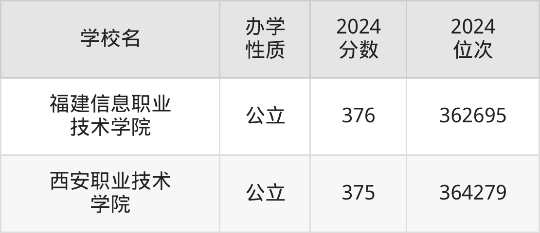 | 福建信息职业 技术学院 | 376 | 362695 |