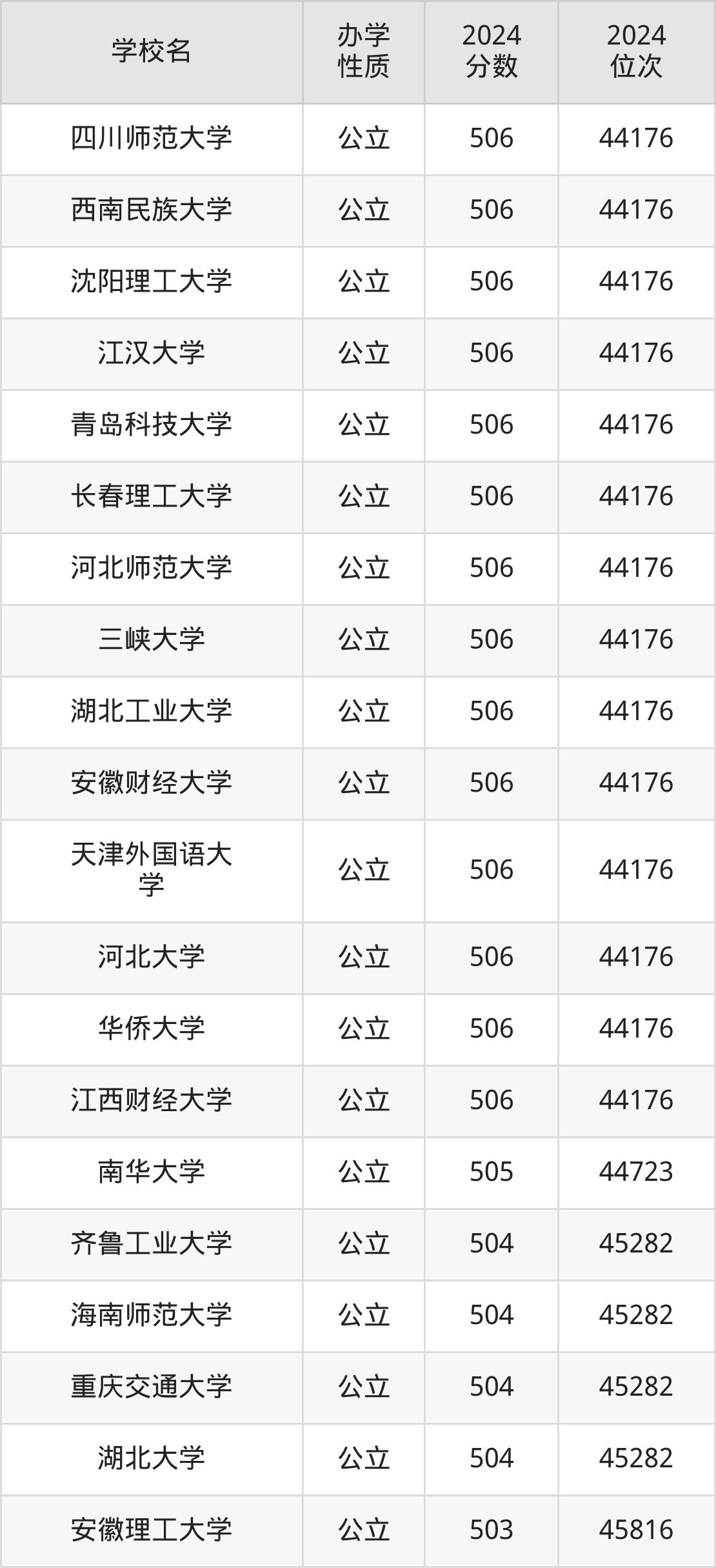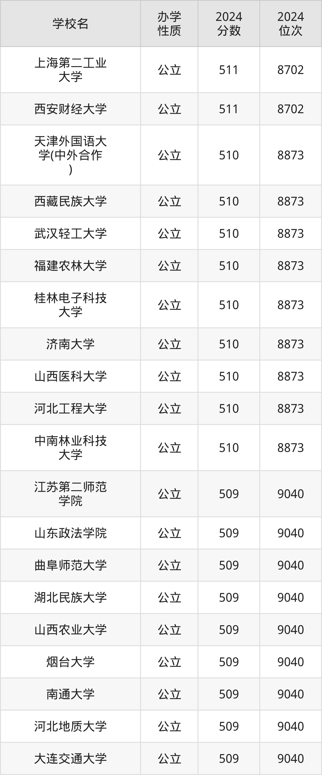 山西506分左右的考生可以上上海第二工业大学、西安财经大学、天津外国语大学(中外合作)等院校,刚好在506分的院校有西藏大学、鲁东大学、南京艺术学院等。