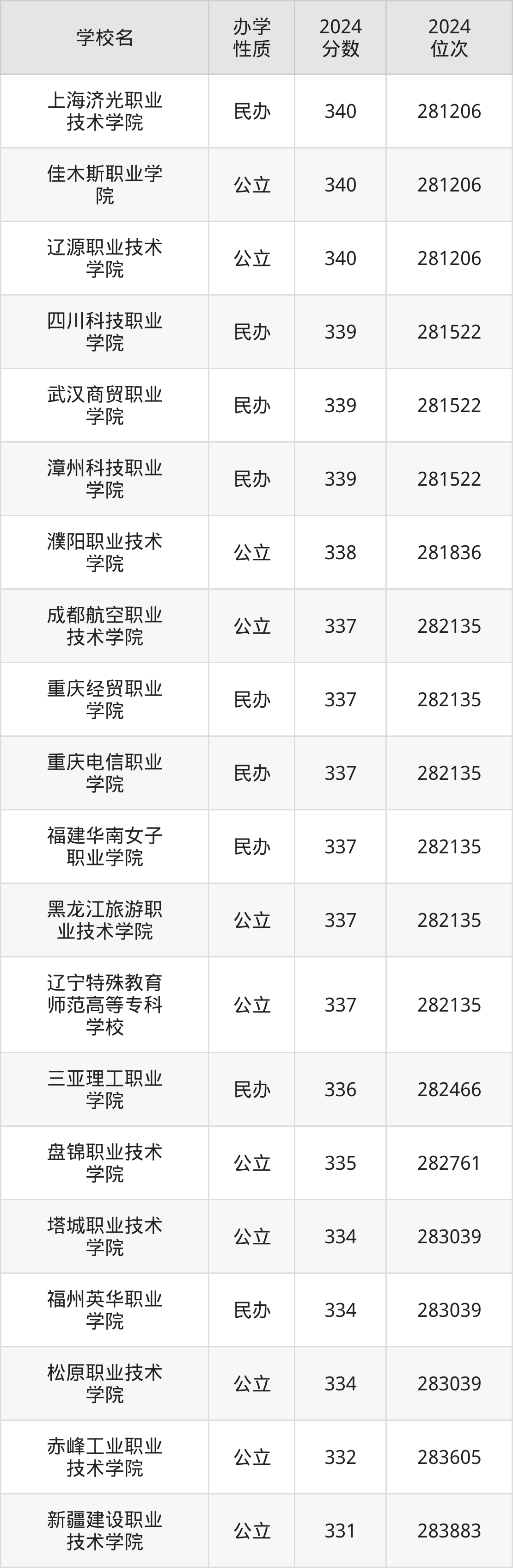 | 重庆电信职业 学院 | 337 | 282135 |