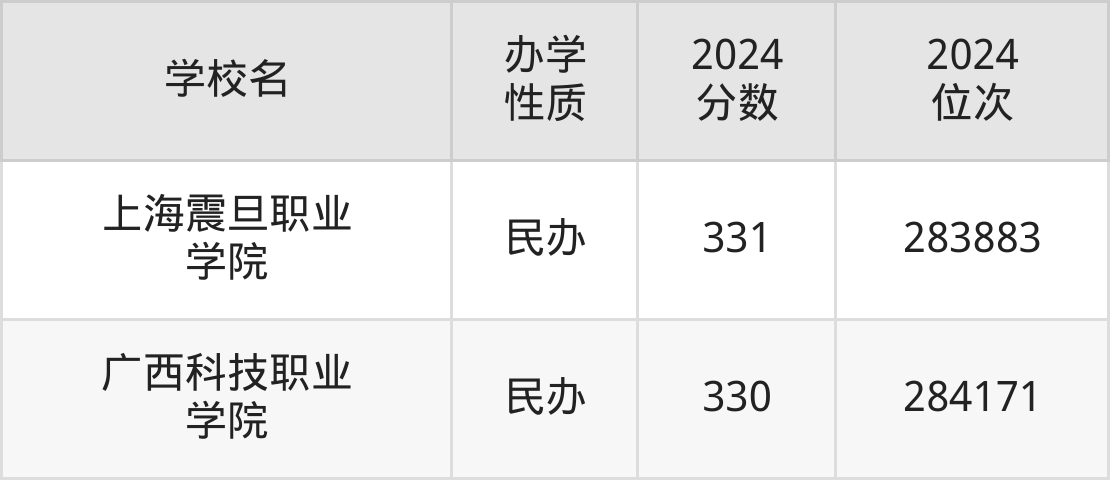 | 广西科技职业 学院 | 330 | 284171 |