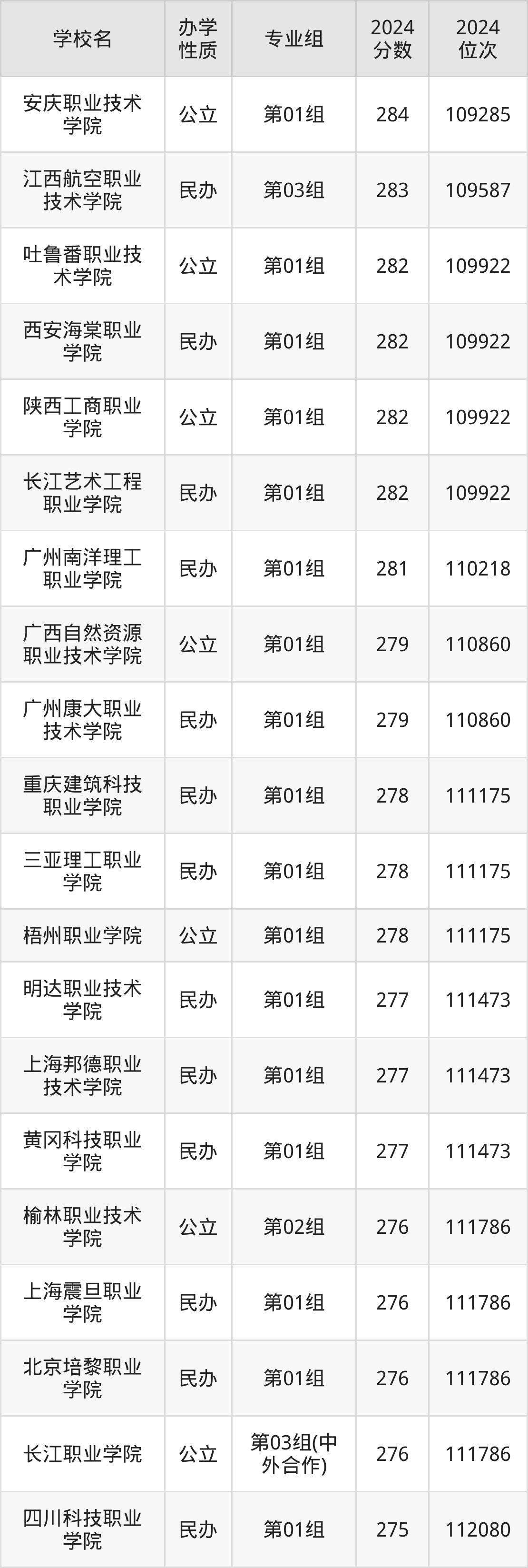 2024年湖北历史类280分考生能上安庆职业技术学院、江西航空职业技术学院、吐鲁番职业技术学院、西安海棠职业学院、陕西工商职业学院等21所专科院校,具体录取分数线及位次为: