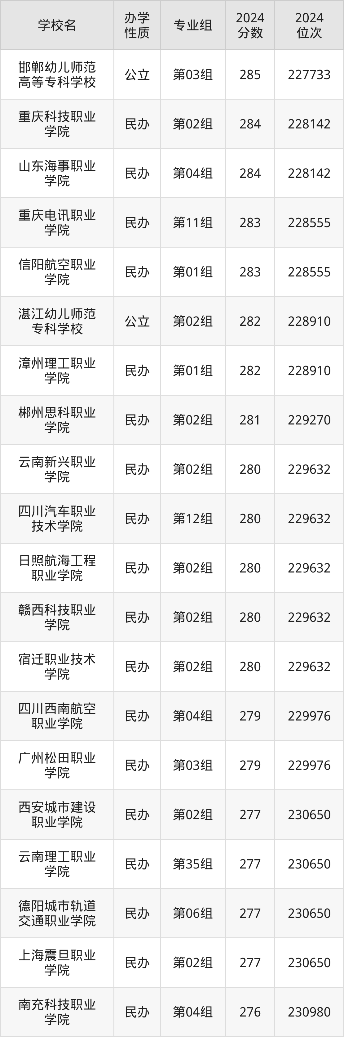 2024年湖北物理类280分考生能上邯郸幼儿师范高等专科学校、重庆科技职业学院、山东海事职业学院、重庆电讯职业学院、信阳航空职业学院等21所专科院校,具体录取分数线及位次为: