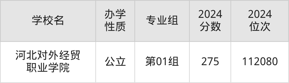 | 河北对外经贸 职业学院 | 第01组 | 275 | 112080 |