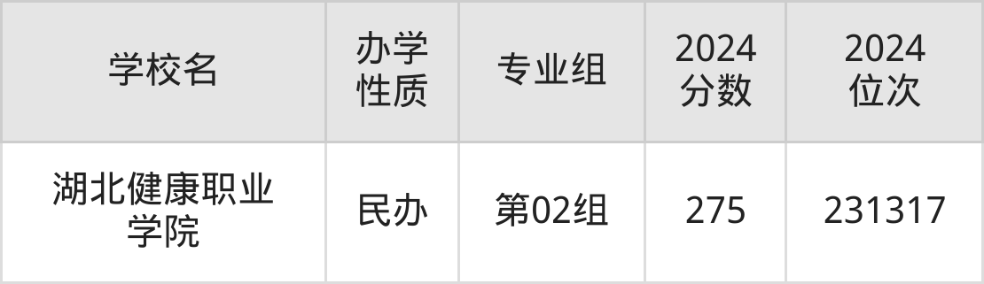 | 湖北健康职业 学院 | 第02组 | 275 | 231317 |