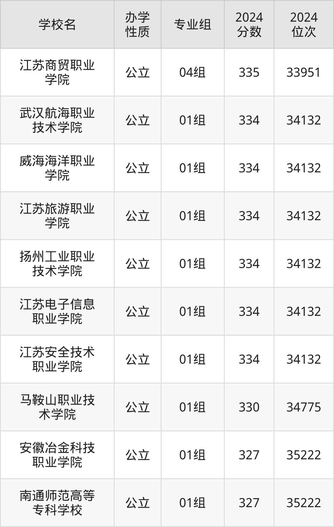 2024年江苏历史类330分考生能上江苏商贸职业学院、武汉航海职业技术学院、威海海洋职业学院、江苏旅游职业学院、扬州工业职业技术学院等10所专科院校,具体录取分数线及位次为: