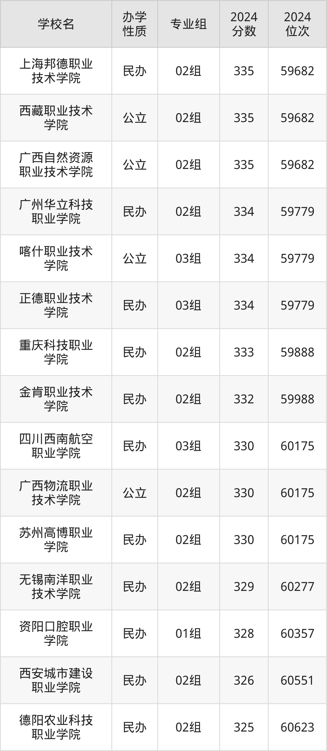 2024年江苏物理类330分考生能上上海邦德职业技术学院、西藏职业技术学院、广西自然资源职业技术学院、广州华立科技职业学院、喀什职业技术学院等15所专科院校,具体录取分数线及位次为:
