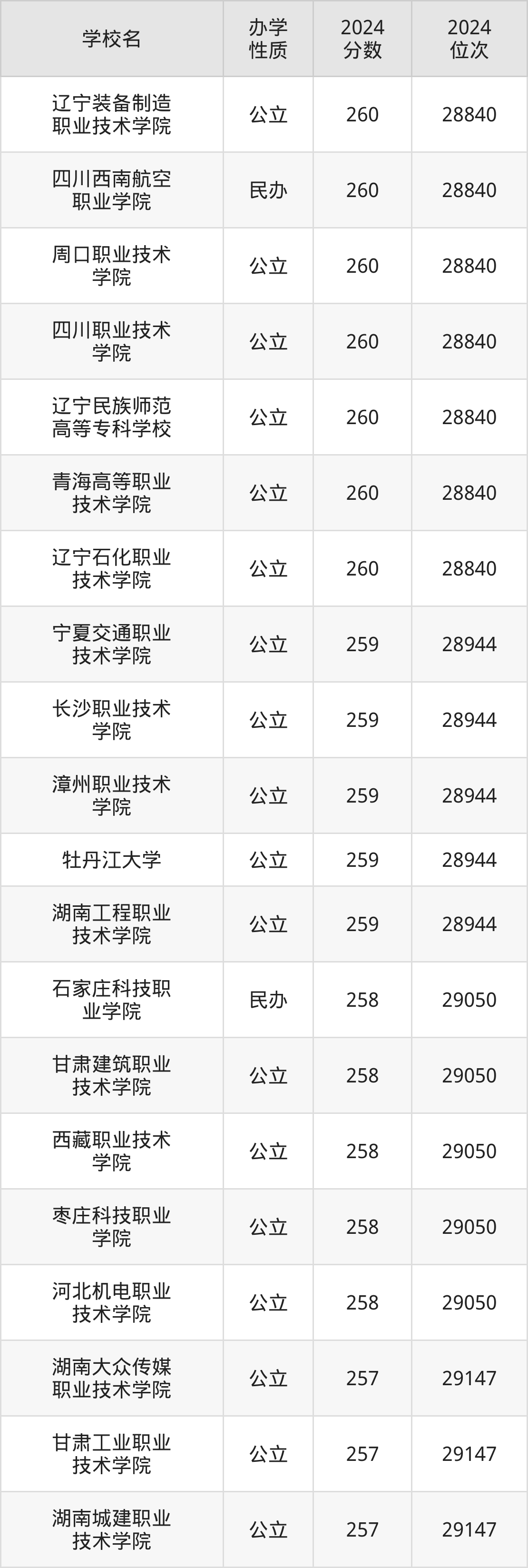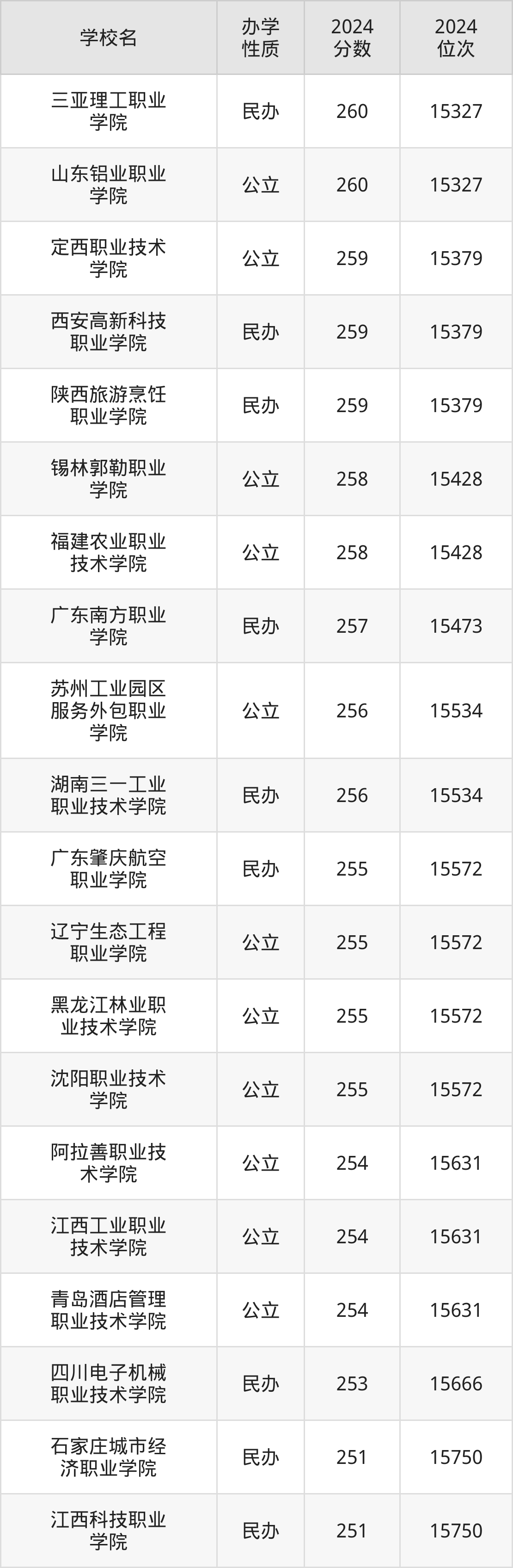 2024年青海文科255分考生能上三亚理工职业学院、山东铝业职业学院、定西职业技术学院、西安高新科技职业学院、陕西旅游烹饪职业学院等23所专科院校,具体录取分数线及位次为: