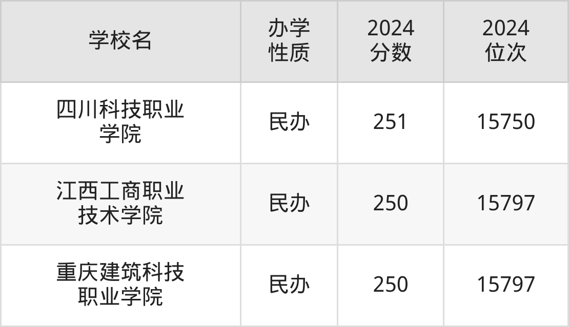 | 重庆建筑科技 职业学院 | 250 | 15797 |