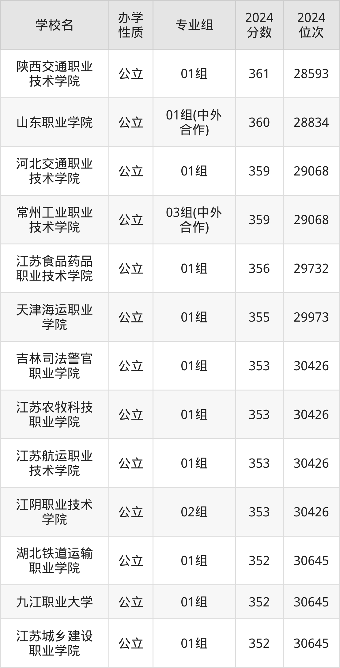 2024年江苏历史类357分考生能上陕西交通职业技术学院、山东职业学院、河北交通职业技术学院、常州工业职业技术学院、江苏食品药品职业技术学院等13所专科院校,具体录取分数线及位次为: