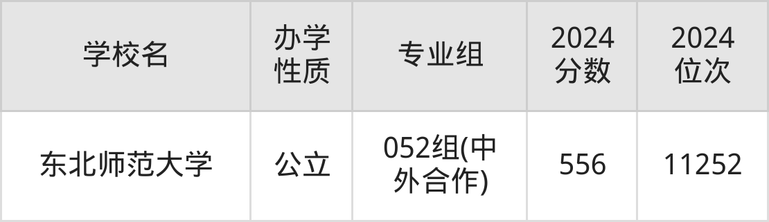 | 东北师范大学 | 052组(中 外合作) | 556 | 11252 |
