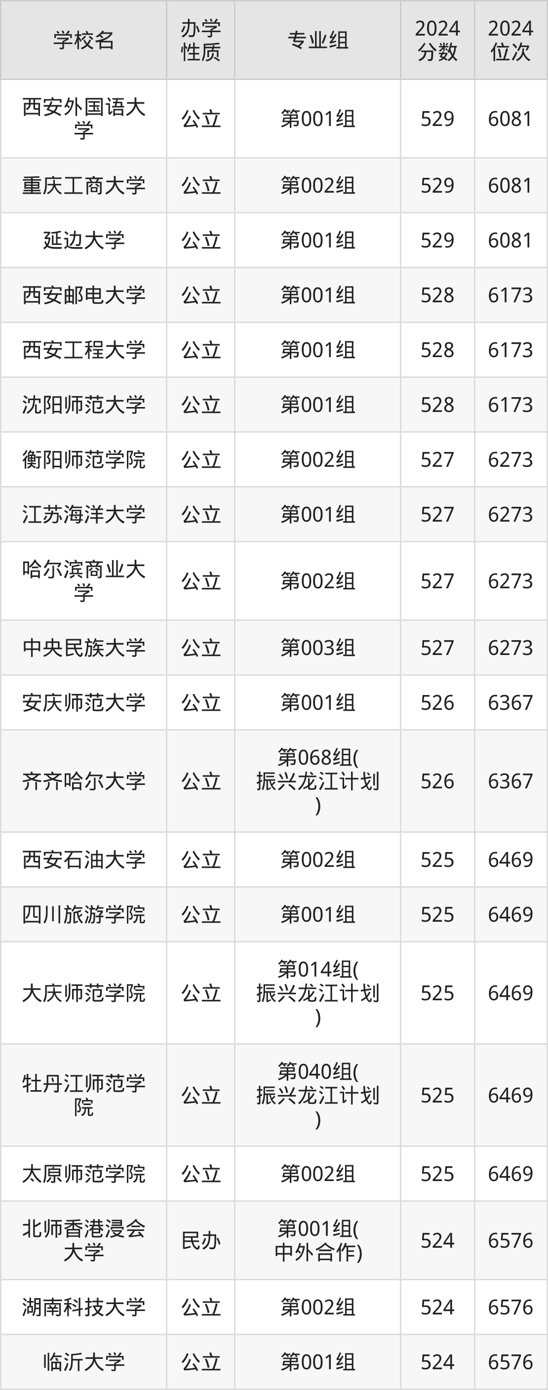 2024年黑龙江历史类524分考生能上西安外国语大学、重庆工商大学、延边大学、西安邮电大学、西安工程大学等39所一本院校,具体录取分数线及位次为:
