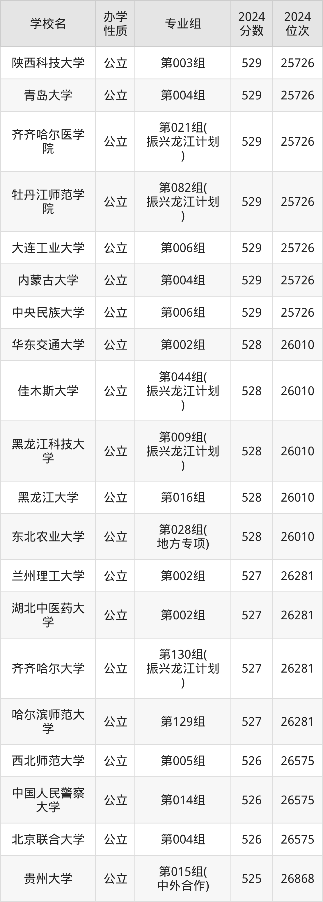 2024年黑龙江物理类524分考生能上陕西科技大学、青岛大学、齐齐哈尔医学院、牡丹江师范学院、大连工业大学等64所一本院校,具体录取分数线及位次为: