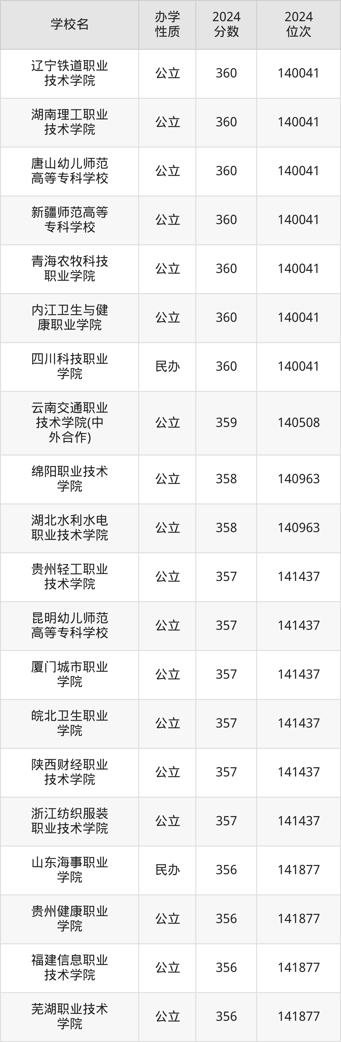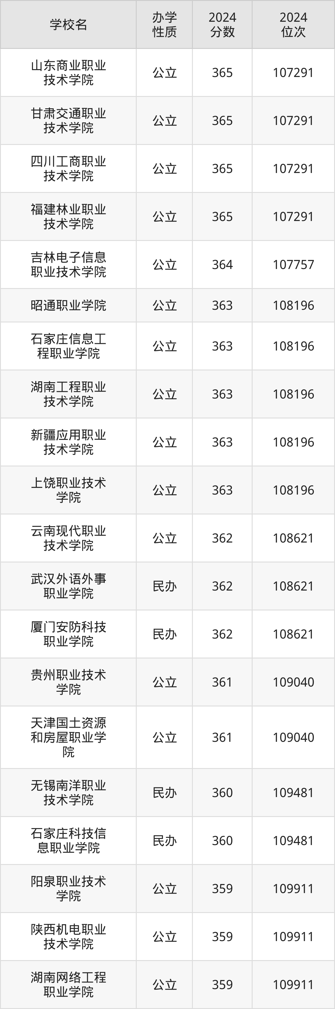 2024年云南文科360分考生能上山东商业职业技术学院、甘肃交通职业技术学院、四川工商职业技术学院、福建林业职业技术学院、吉林电子信息职业技术学院等35所专科院校,具体录取分数线及位次为: