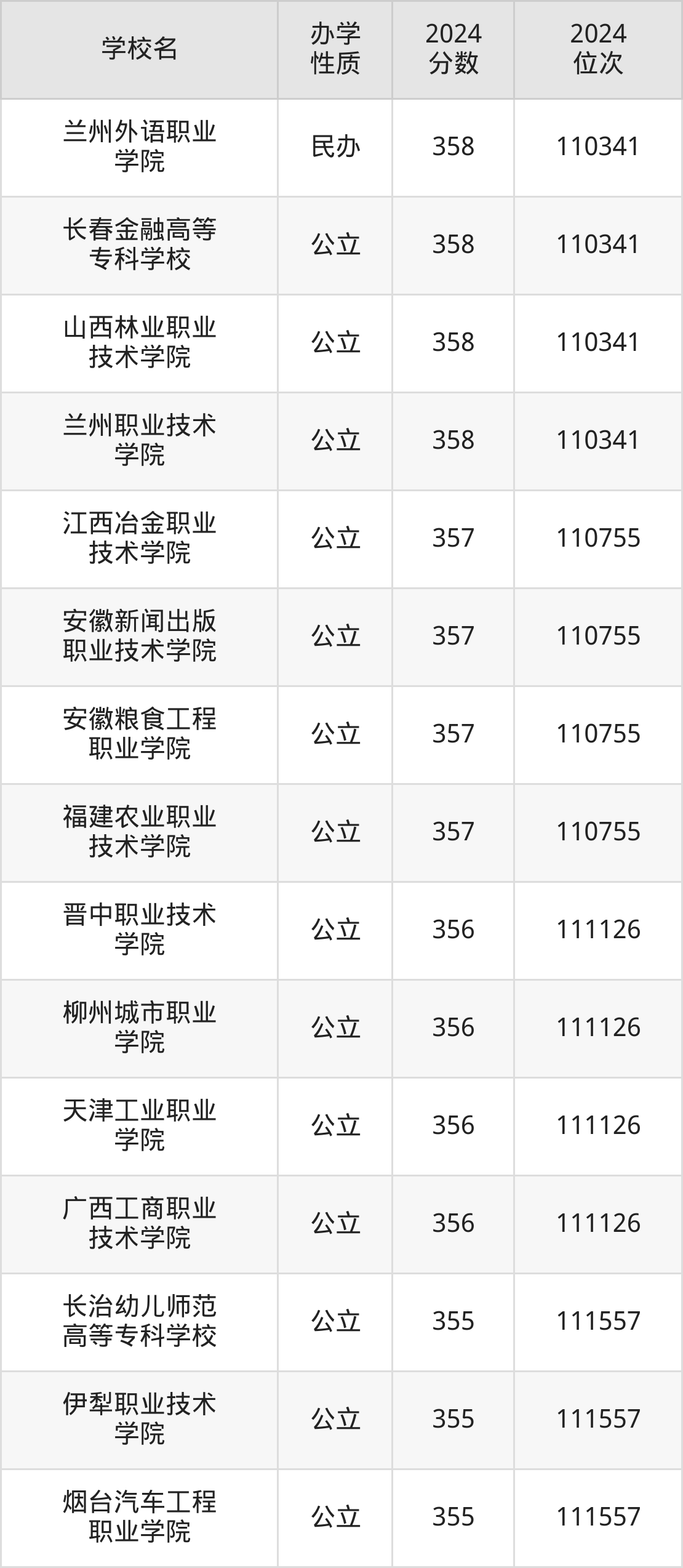 | 长春金融高等 专科学校 | 358 | 110341 |