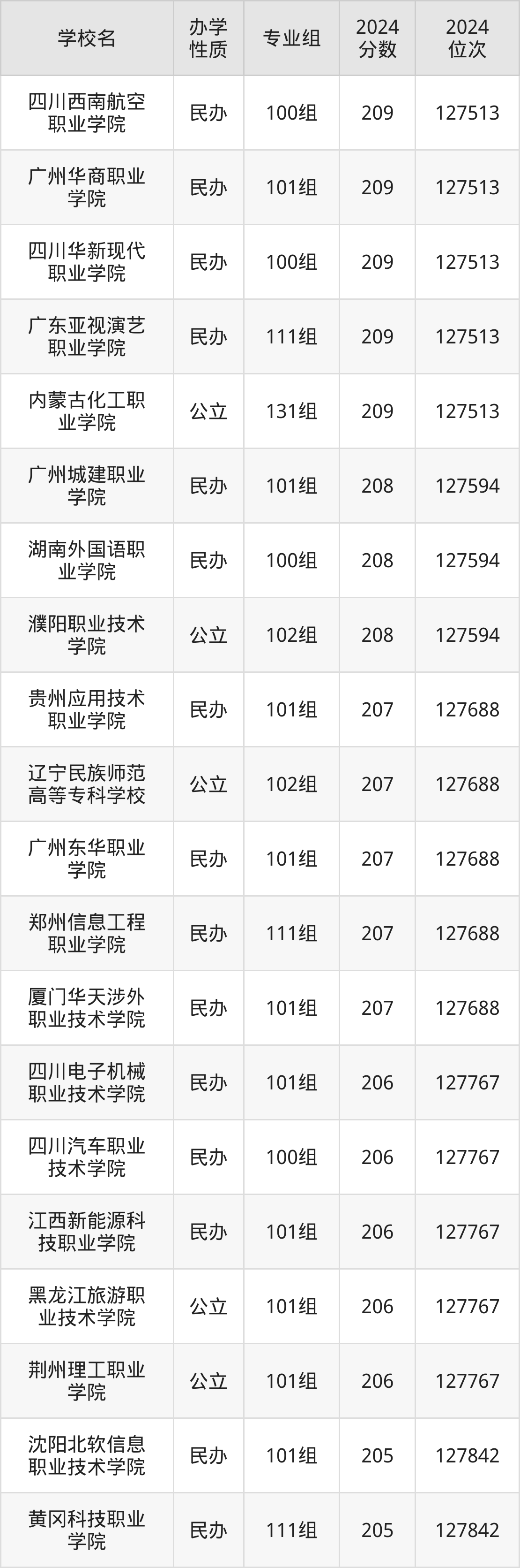 2024年广西历史类204分考生能上四川西南航空职业学院、广州华商职业学院、四川华新现代职业学院、广东亚视演艺职业学院、内蒙古化工职业学院等53所专科院校,具体录取分数线及位次为: