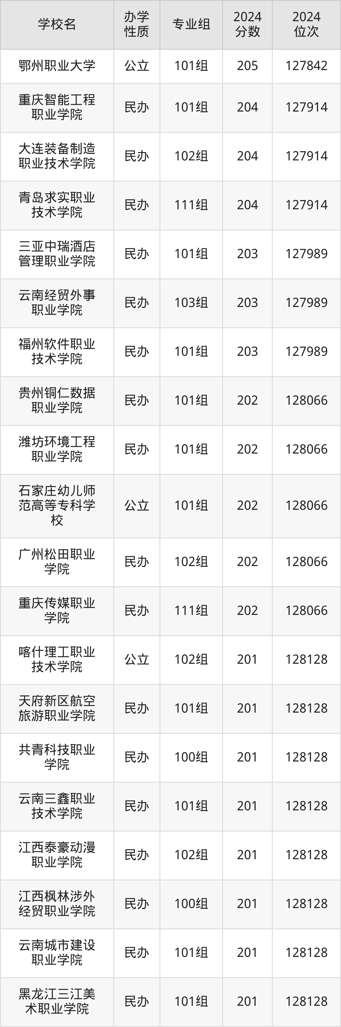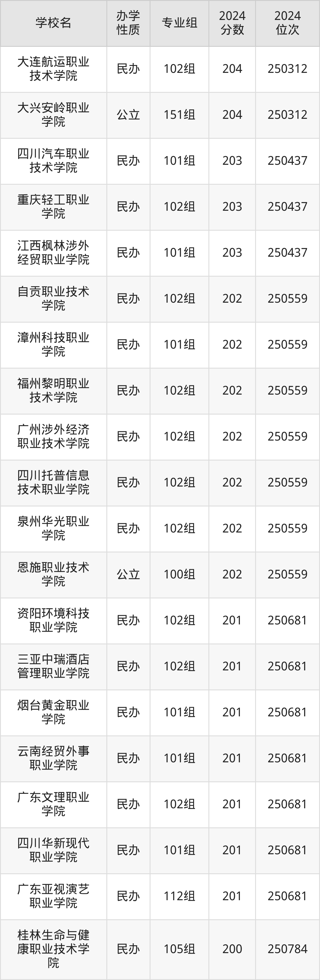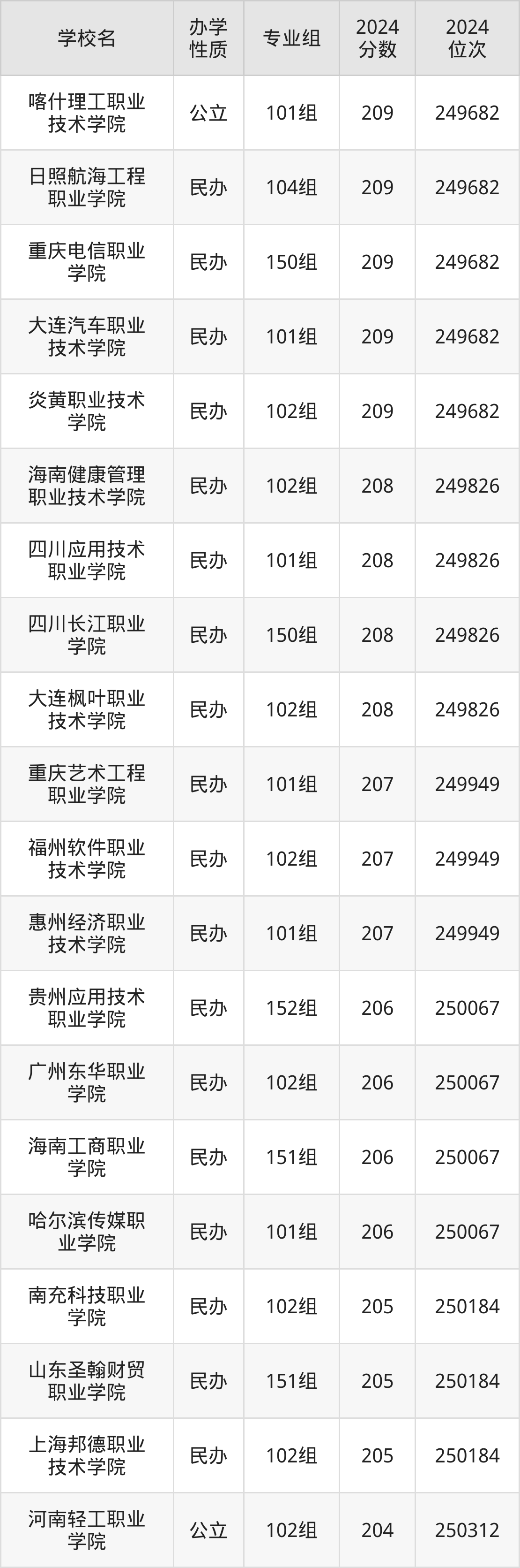 2024年广西物理类204分考生能上喀什理工职业技术学院、日照航海工程职业学院、重庆电信职业学院、大连汽车职业技术学院、炎黄职业技术学院等49所专科院校,具体录取分数线及位次为: