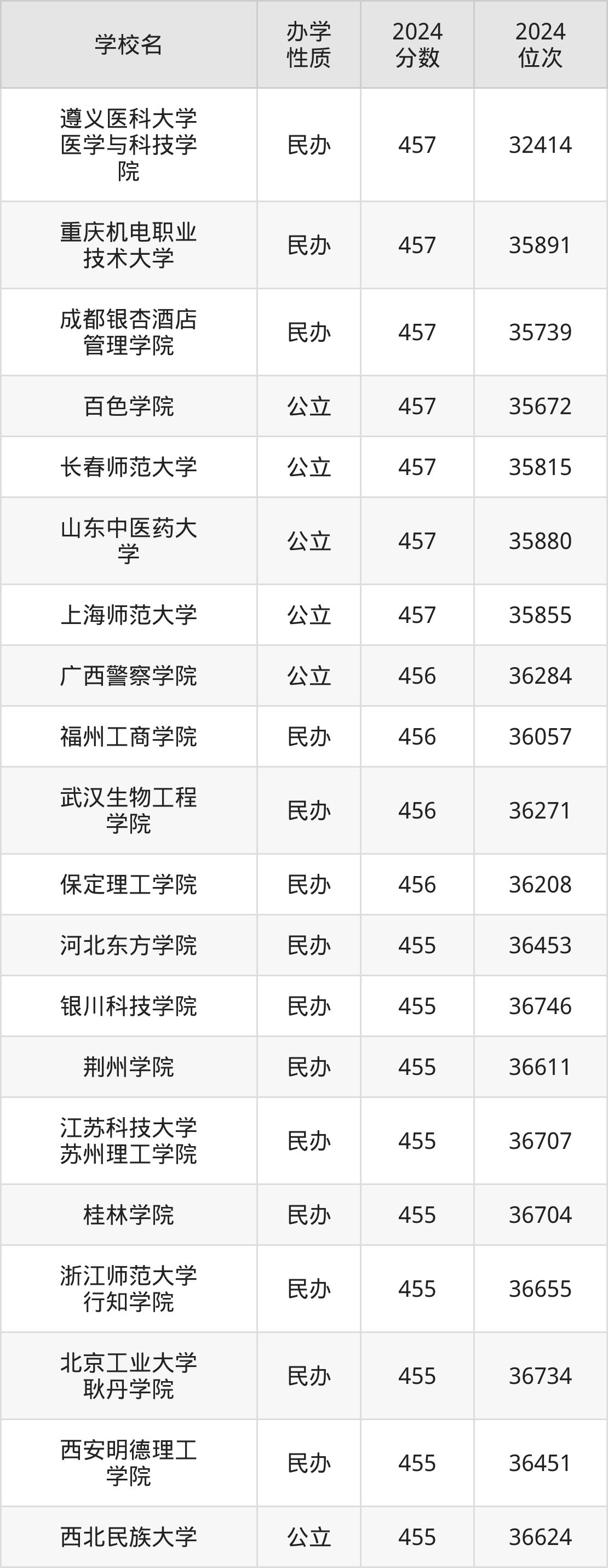 2024年贵州历史类452分考生能上遵义医科大学医学与科技学院、重庆机电职业技术大学、成都银杏酒店管理学院、百色学院、长春师范大学等136所二本院校,具体录取分数线及位次为:
