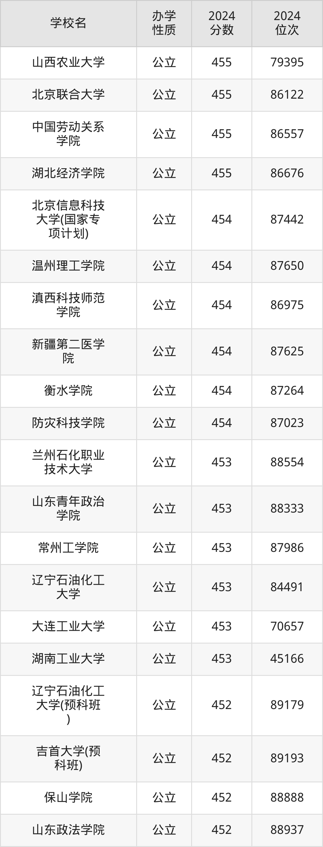2024年贵州物理类452分考生能上防灾科技学院(国家专项计划)、辽宁科技大学(国家专项计划)、周口师范学院、青海民族大学、湖北工程学院等82所二本院校,具体录取分数线及位次为: