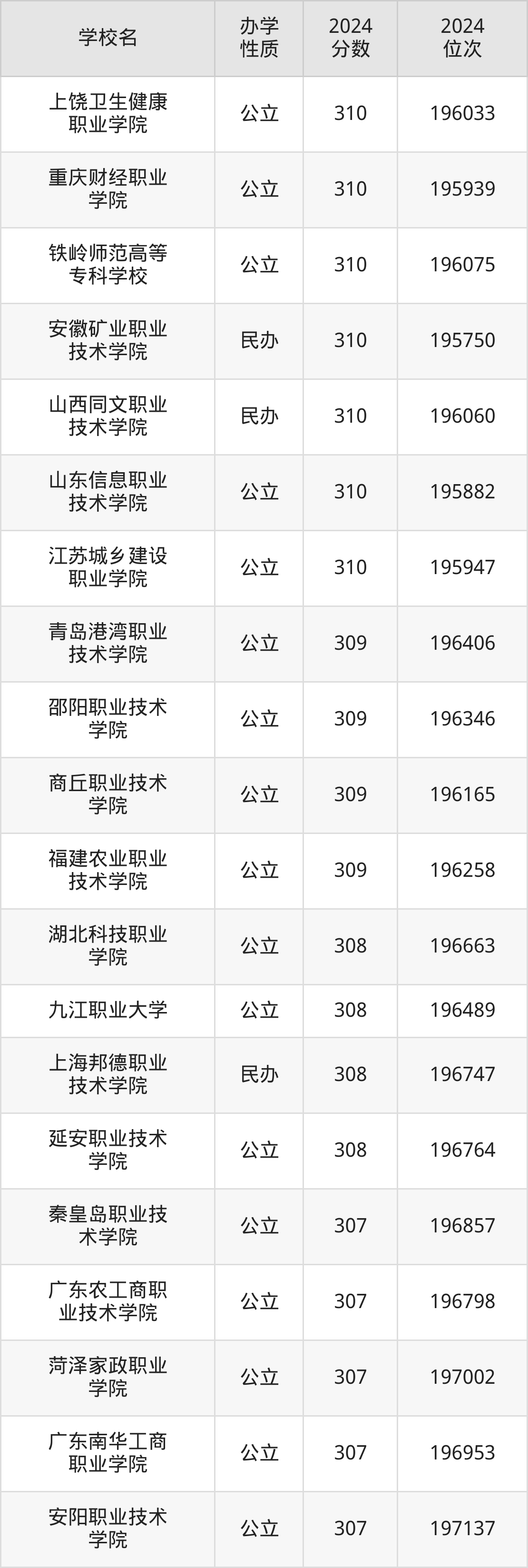 | 上饶卫生健康 职业学院 | 310 | 196033 |