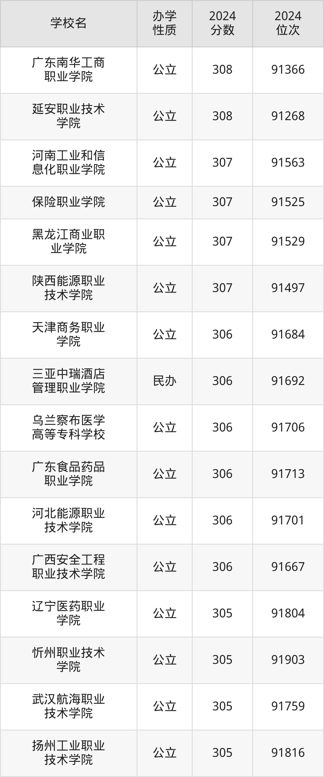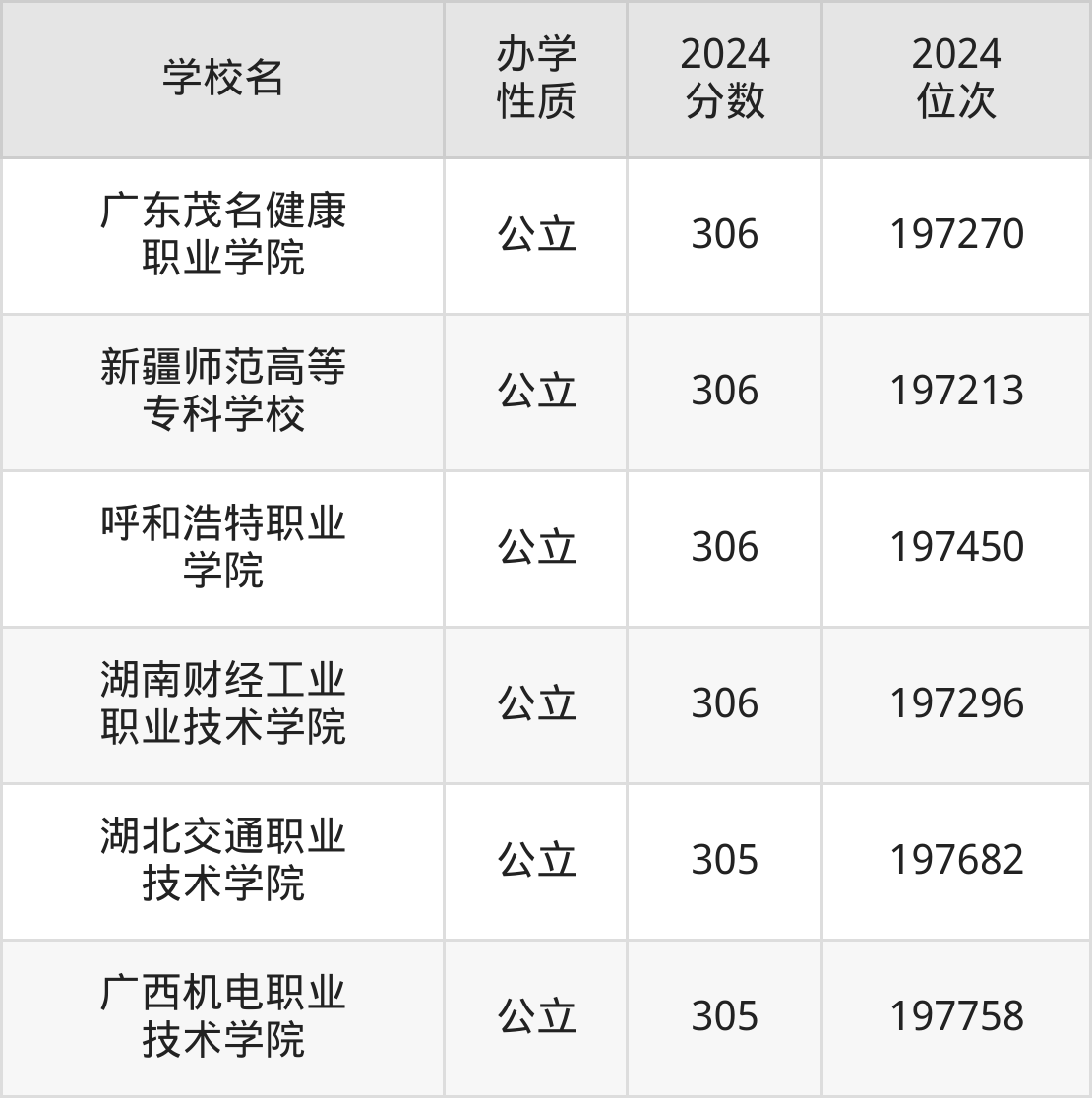 | 广东茂名健康 职业学院 | 306 | 197270 |