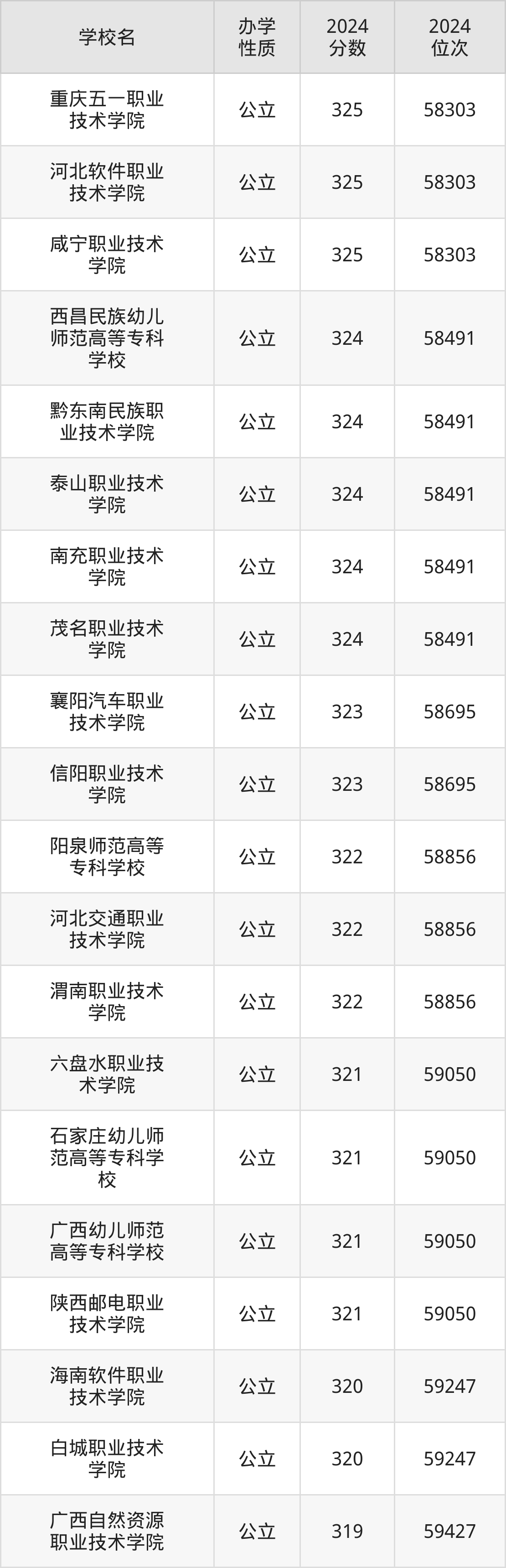 | 南充职业技术 学院 | 324 | 58491 |