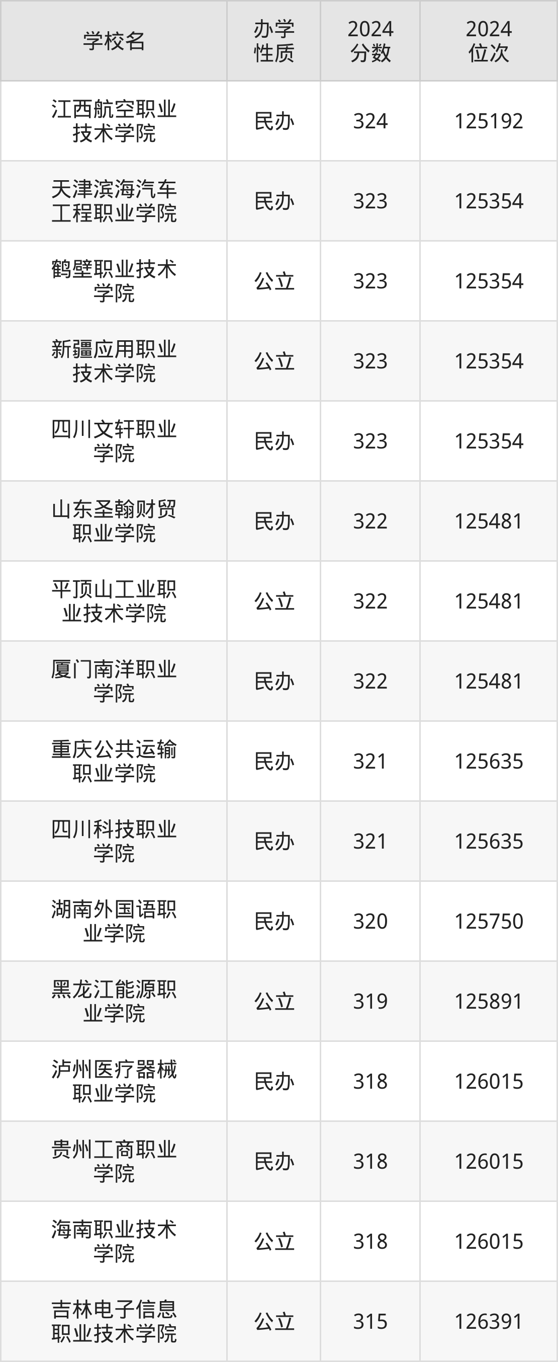 | 江西航空职业 技术学院 | 324 | 125192 |