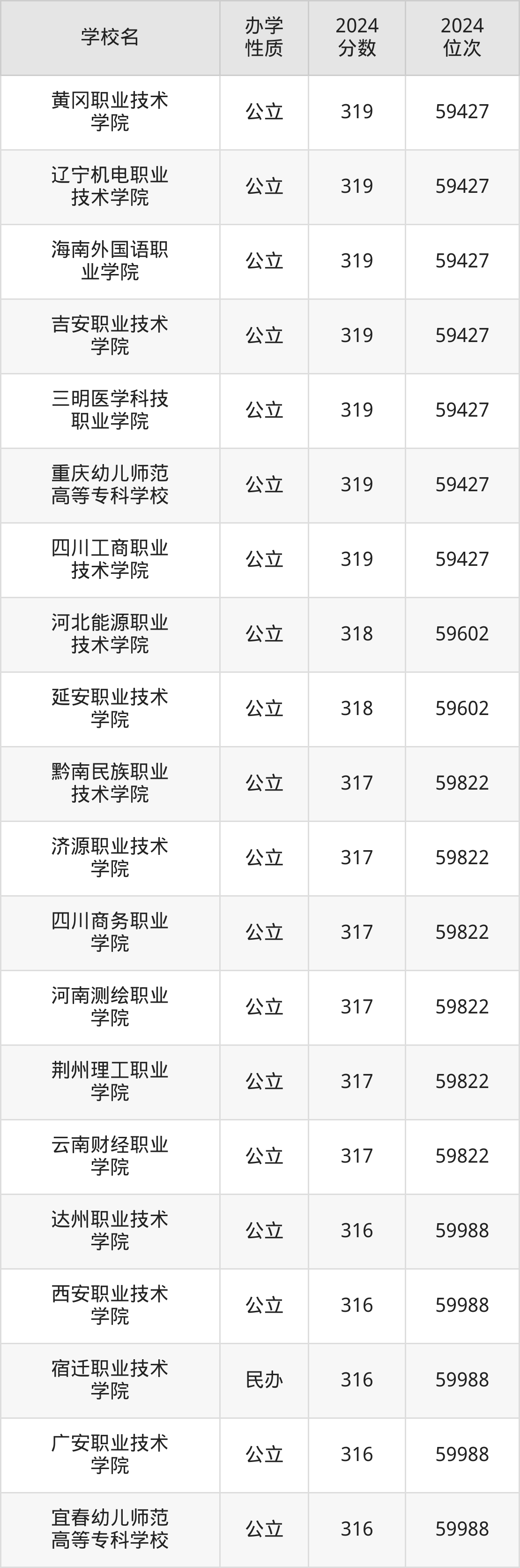 | 达州职业技术 学院 | 316 | 59988 |