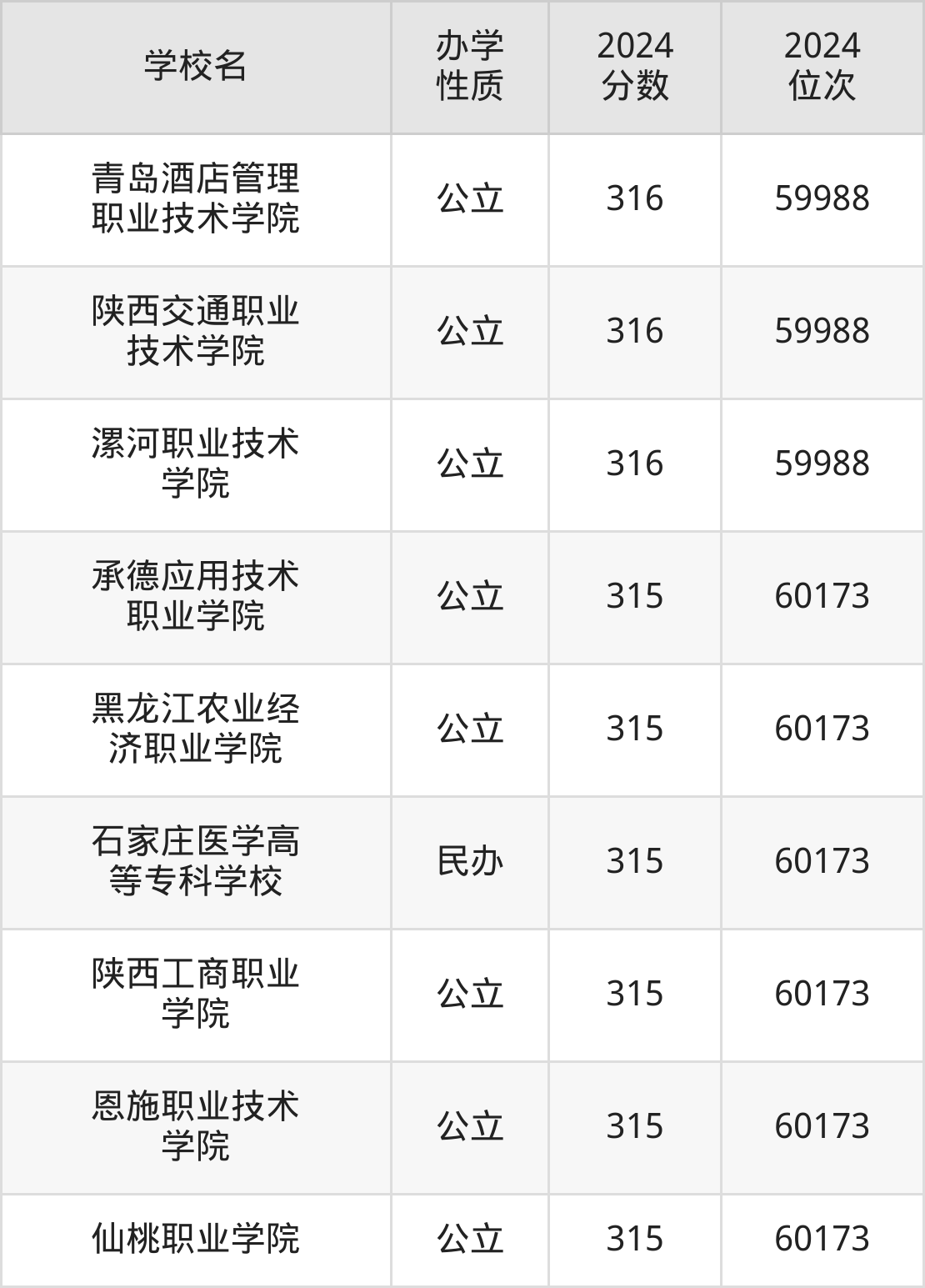 | 黑龙江农业经 济职业学院 | 315 | 60173 |