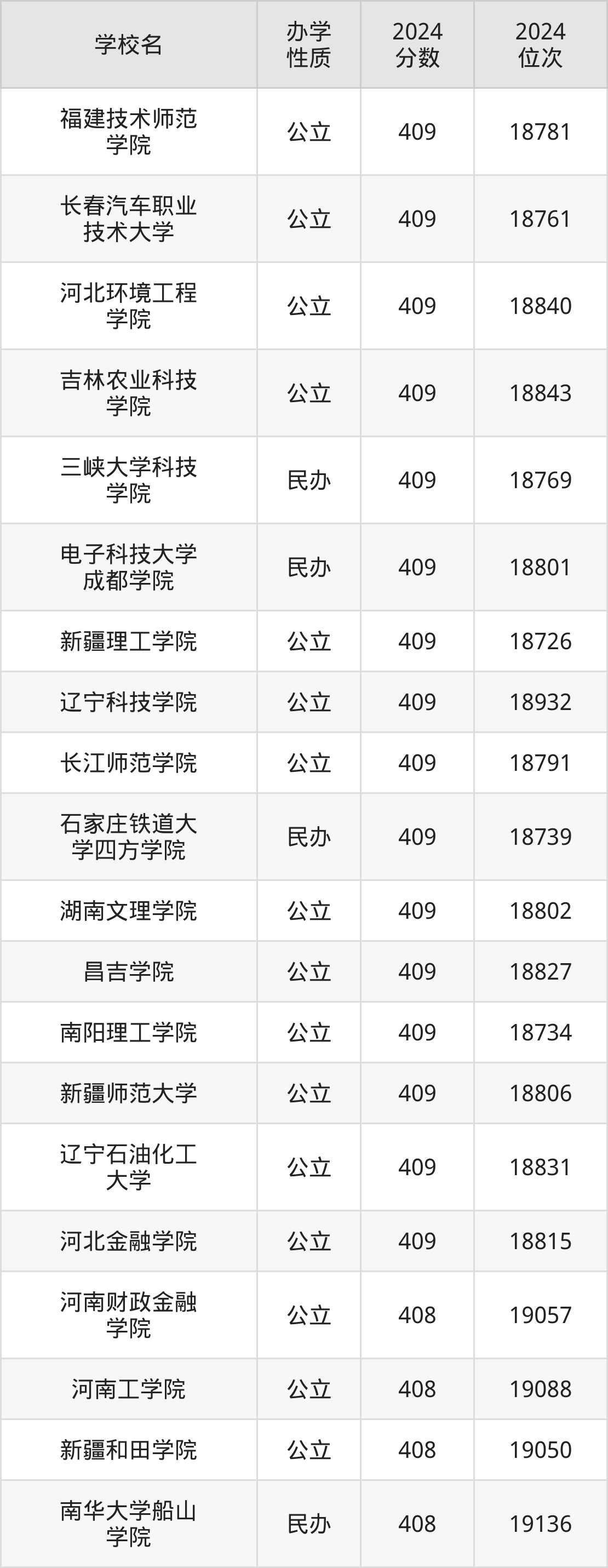 2024年宁夏理科404分考生能上福建技术师范学院、长春汽车职业技术大学、河北环境工程学院、吉林农业科技学院、三峡大学科技学院等89所二本院校,具体录取分数线及位次为: