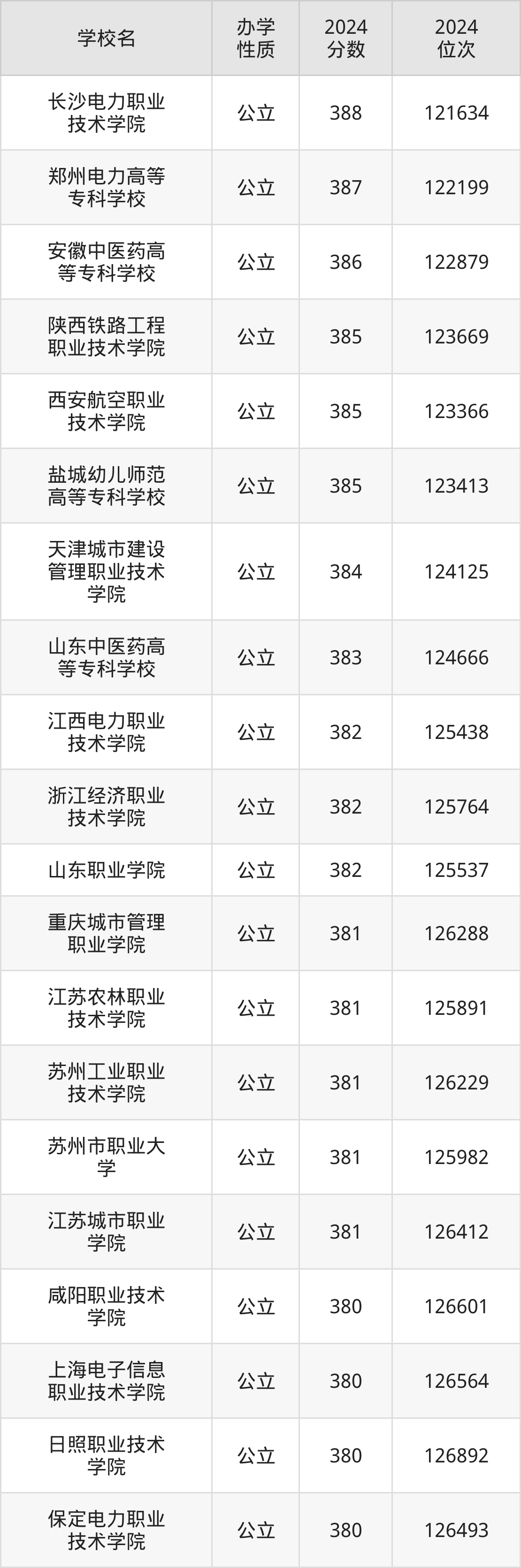 | 咸阳职业技术 学院 | 380 | 126601 |