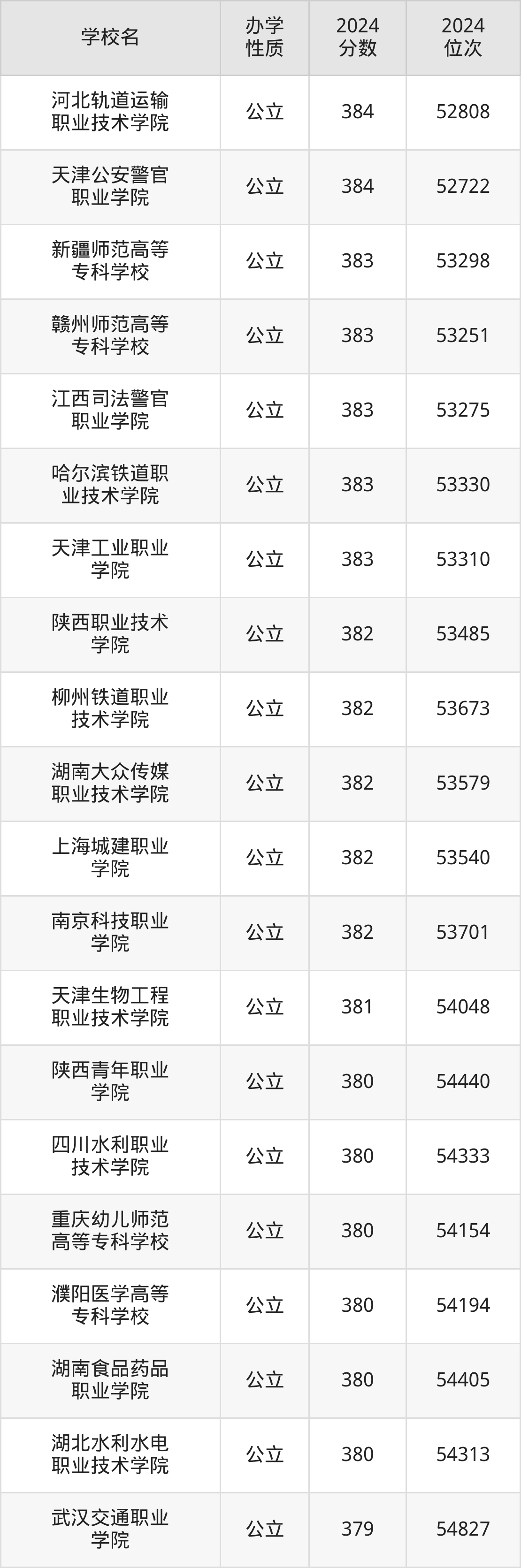 | 湖北水利水电 职业技术学院 | 380 | 54313 |