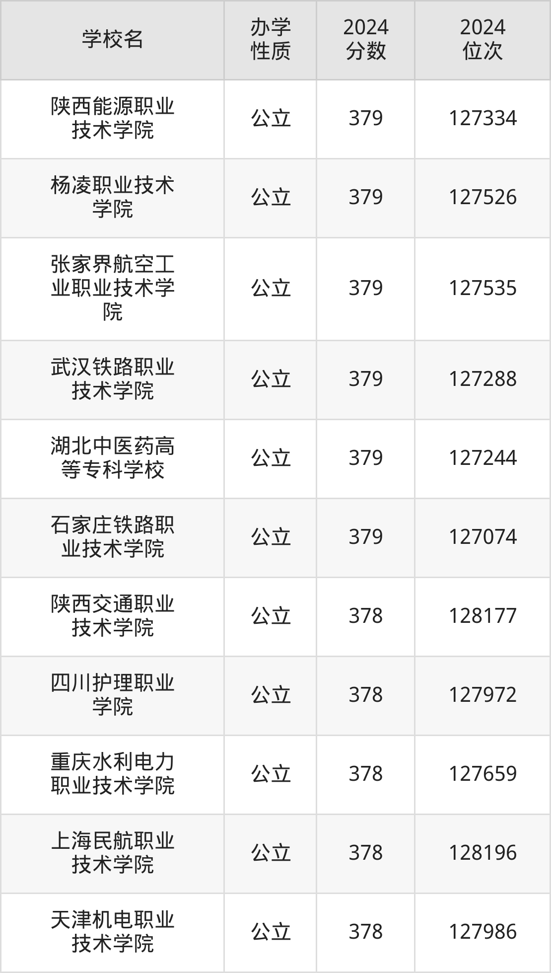 | 杨凌职业技术 学院 | 379 | 127526 |