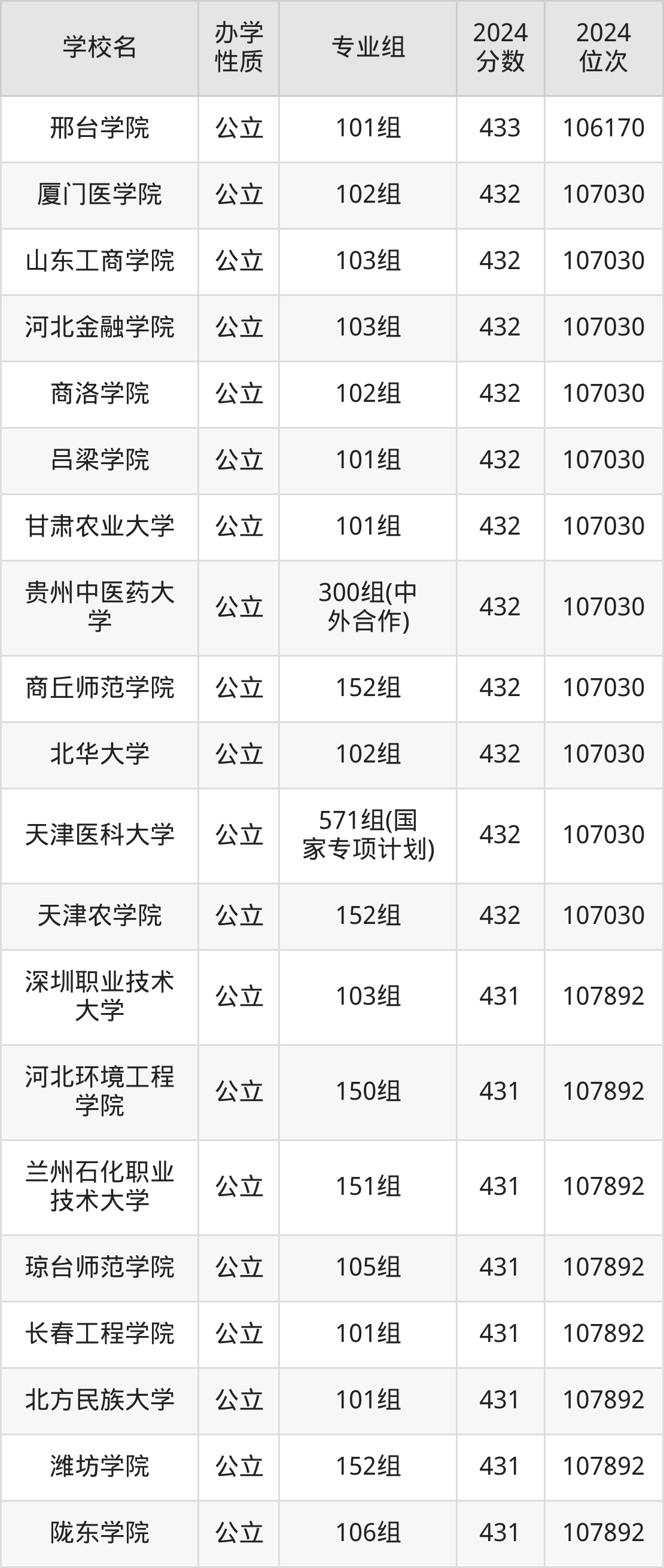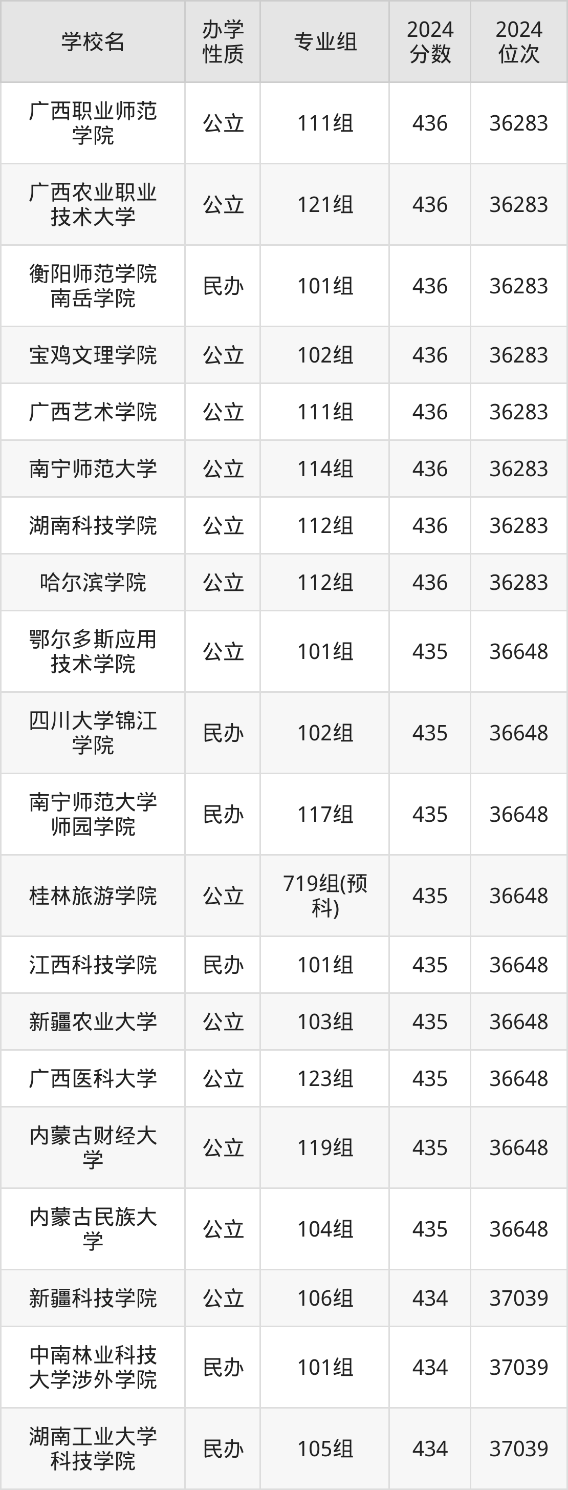 2024年广西历史类431分考生能上广西职业师范学院、广西农业职业技术大学、衡阳师范学院南岳学院、宝鸡文理学院、广西艺术学院等64所二本院校,具体录取分数线及位次为: