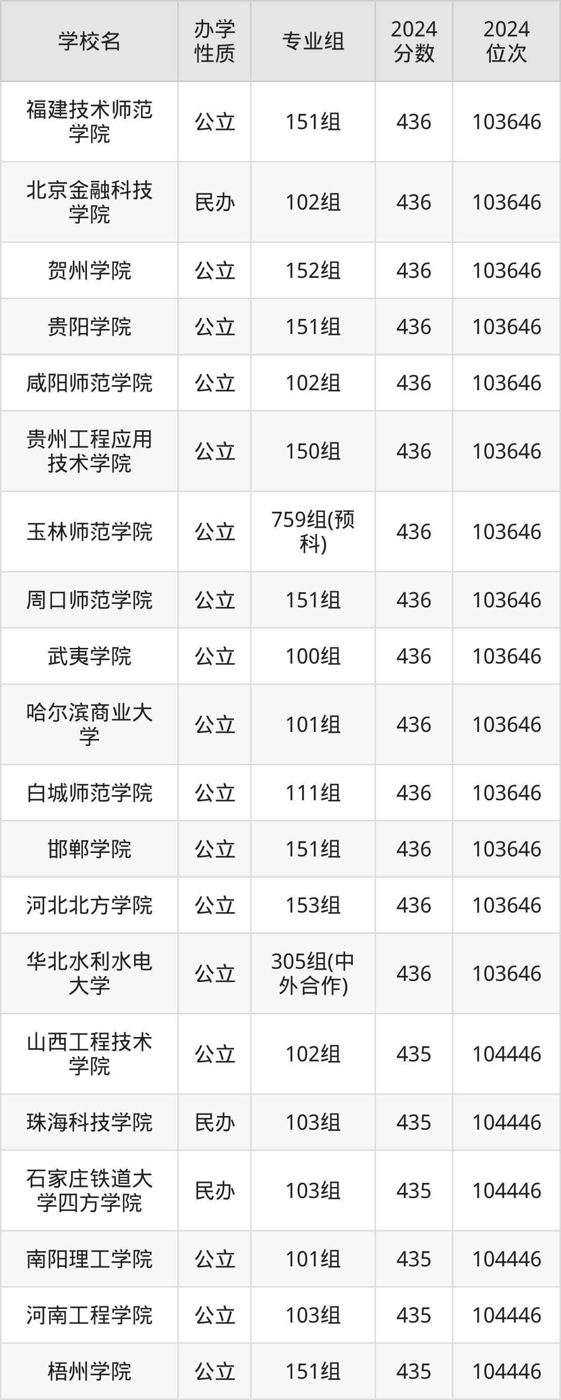 2024年广西物理类431分考生能上福建技术师范学院、北京金融科技学院、贺州学院、贵阳学院、咸阳师范学院等124所二本院校,具体录取分数线及位次为: