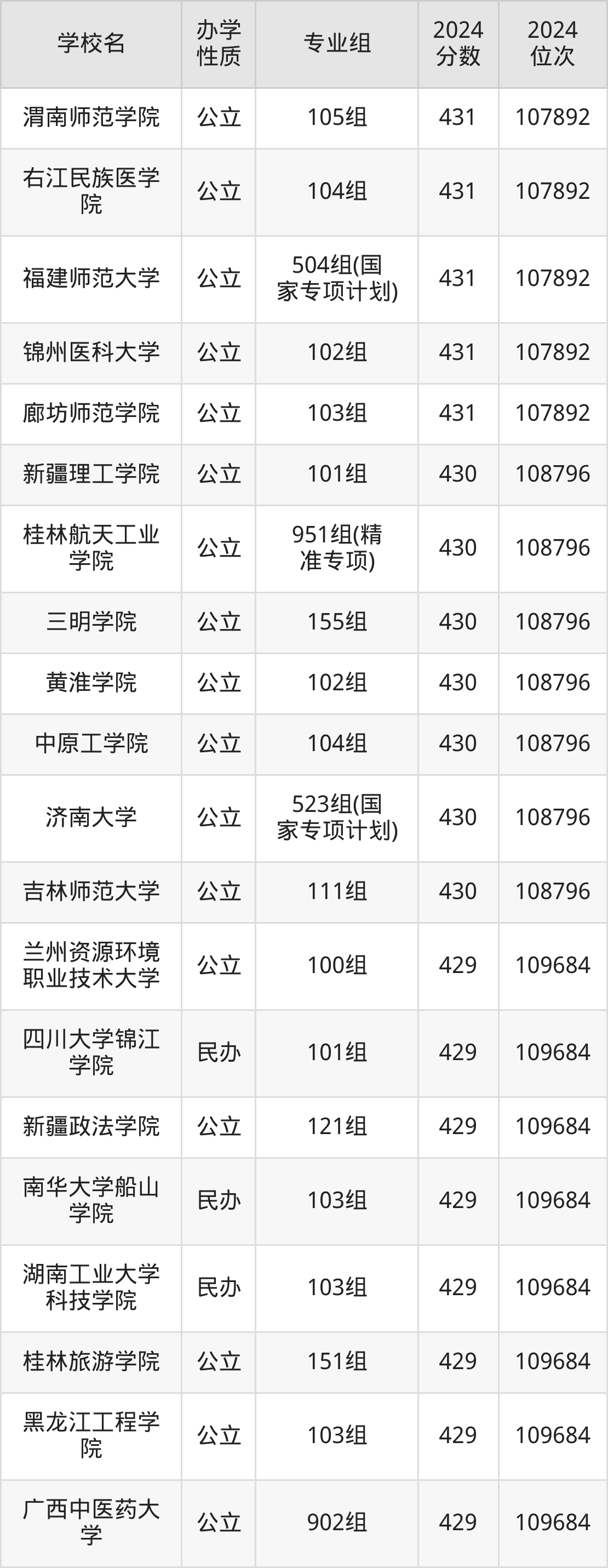 | 广西民族师范 学院 | 759组(预 科) | 428 | 110564 |