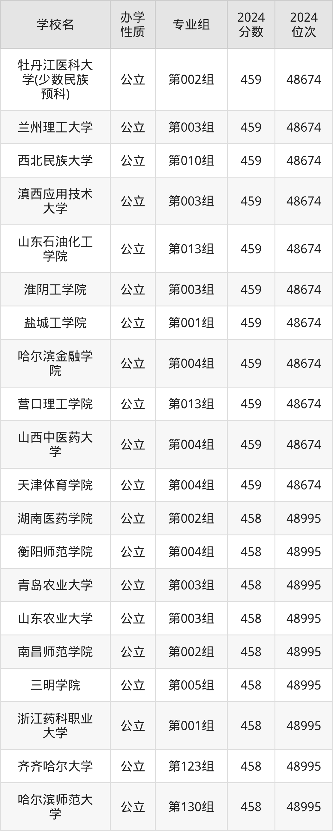 | 牡丹江医科大 学(少数民族 预科) | 第002组 | 459 | 48674 |