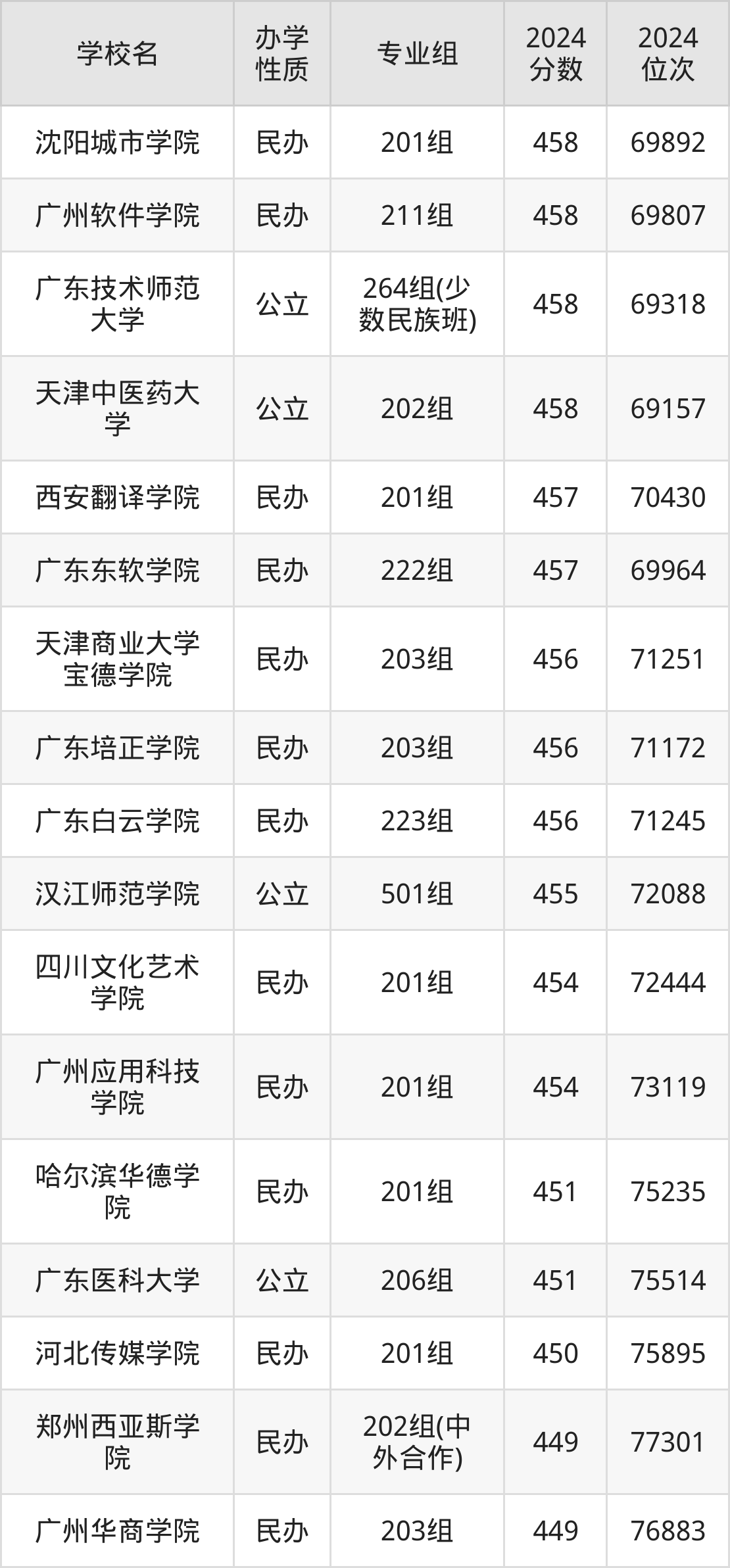 2024年广东历史类453分考生能上沈阳城市学院、广州软件学院、广东技术师范大学、天津中医药大学、西安翻译学院等16所二本院校,具体录取分数线及位次为: