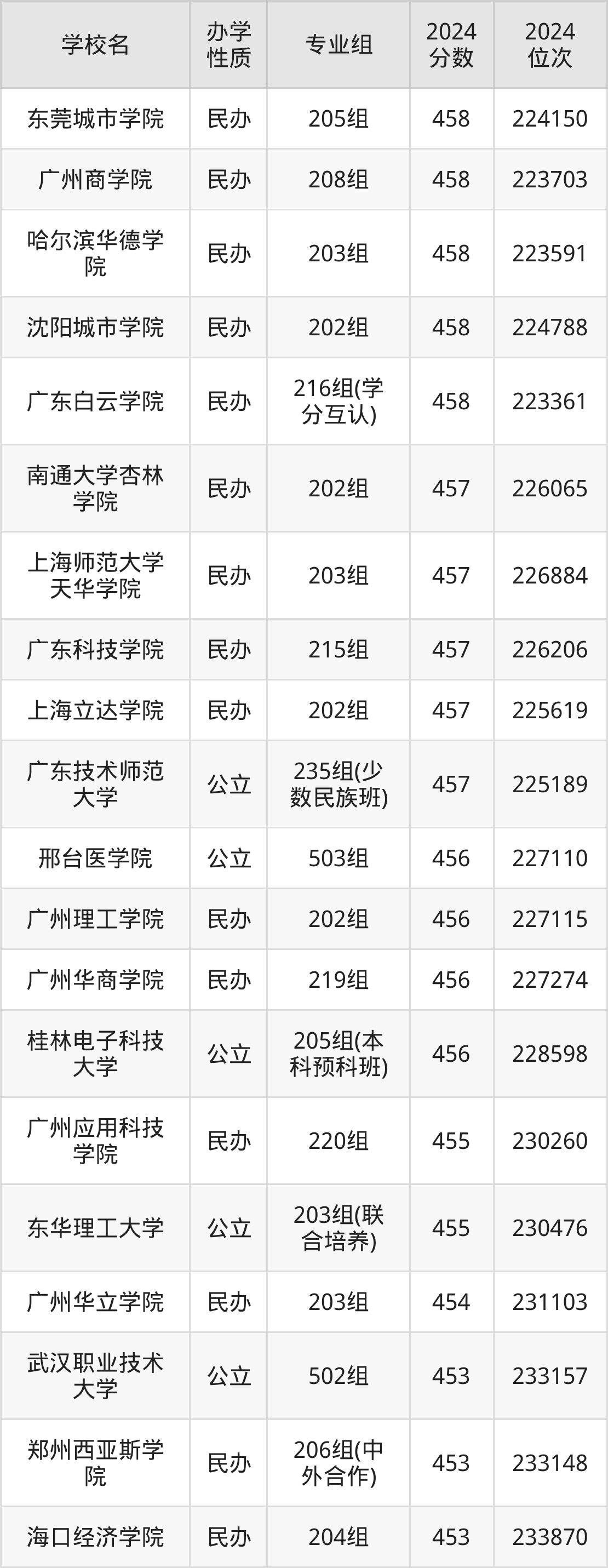 2024年广东物理类453分考生能上东莞城市学院、广州商学院、哈尔滨华德学院、沈阳城市学院、广东白云学院等20所二本院校,具体录取分数线及位次为: