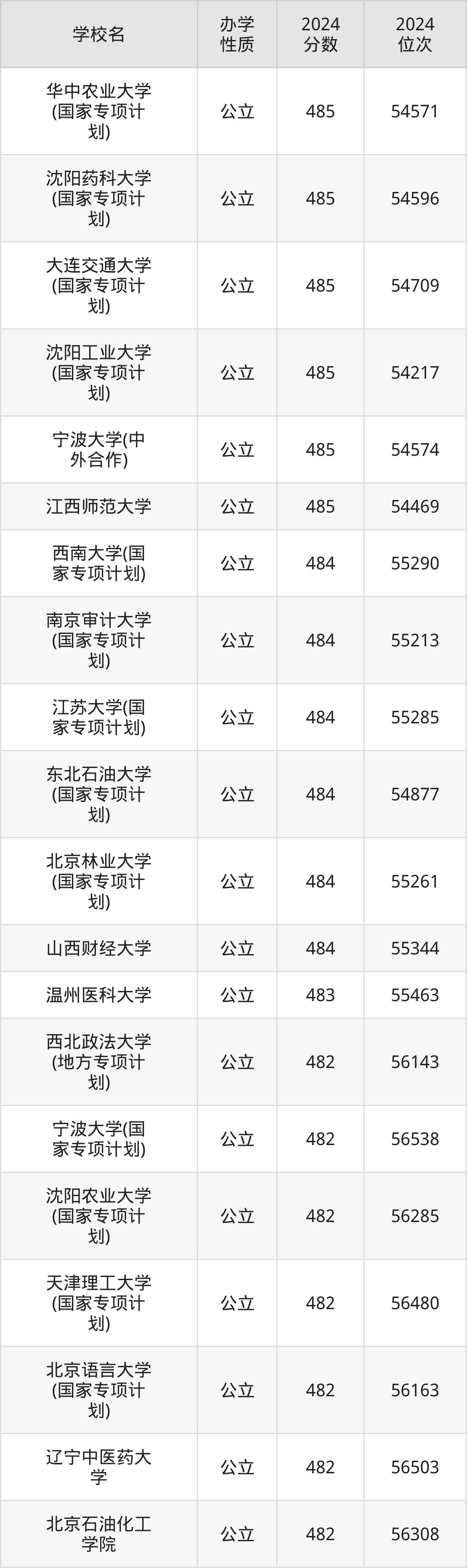 陕西480分左右的考生可以上华中农业大学(国家专项计划)、沈阳药科大学(国家专项计划)、大连交通大学(国家专项计划)等院校,刚好在480分的院校有暨南大学(国家专项计划)、浙江理工大学(国家专项计划)、中国医科大学(国家专项计划)等。