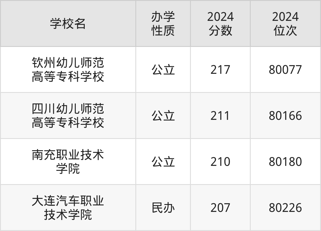 2024年陕西文科212分考生能上钦州幼儿师范高等专科学校、四川幼儿师范高等专科学校、南充职业技术学院、大连汽车职业技术学院4所专科院校,具体录取分数线及位次为: