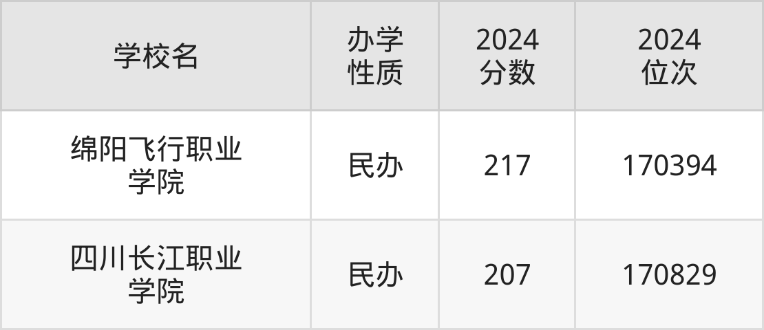 | 绵阳飞行职业 学院 | 217 | 170394 |
