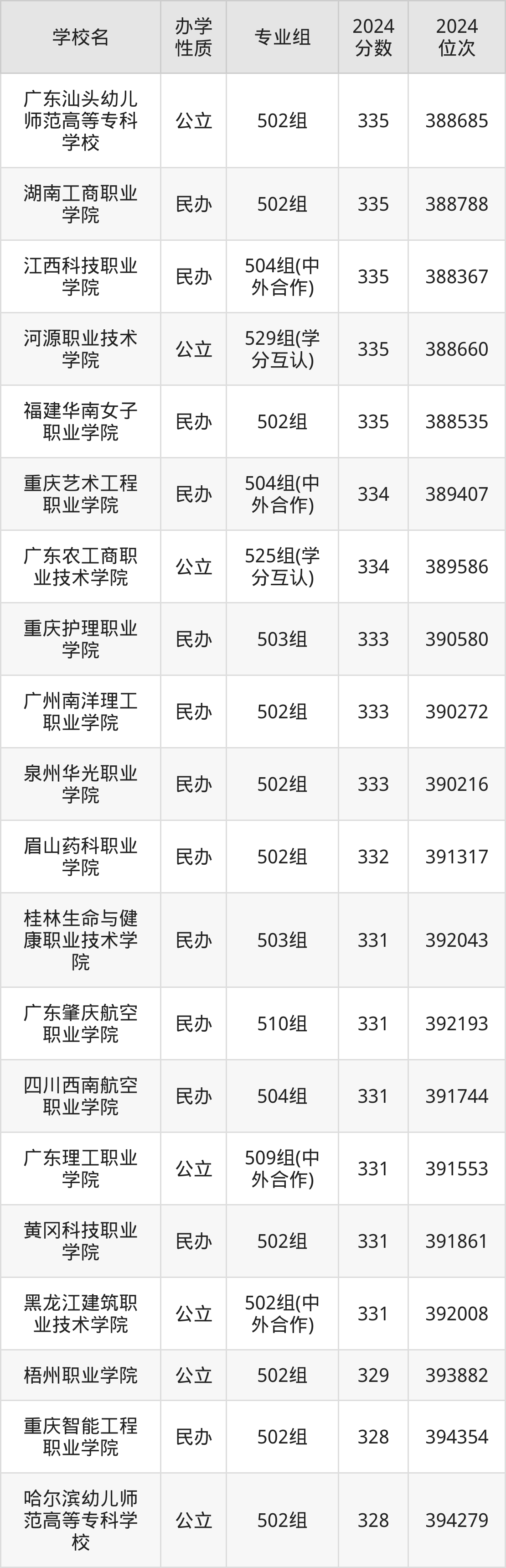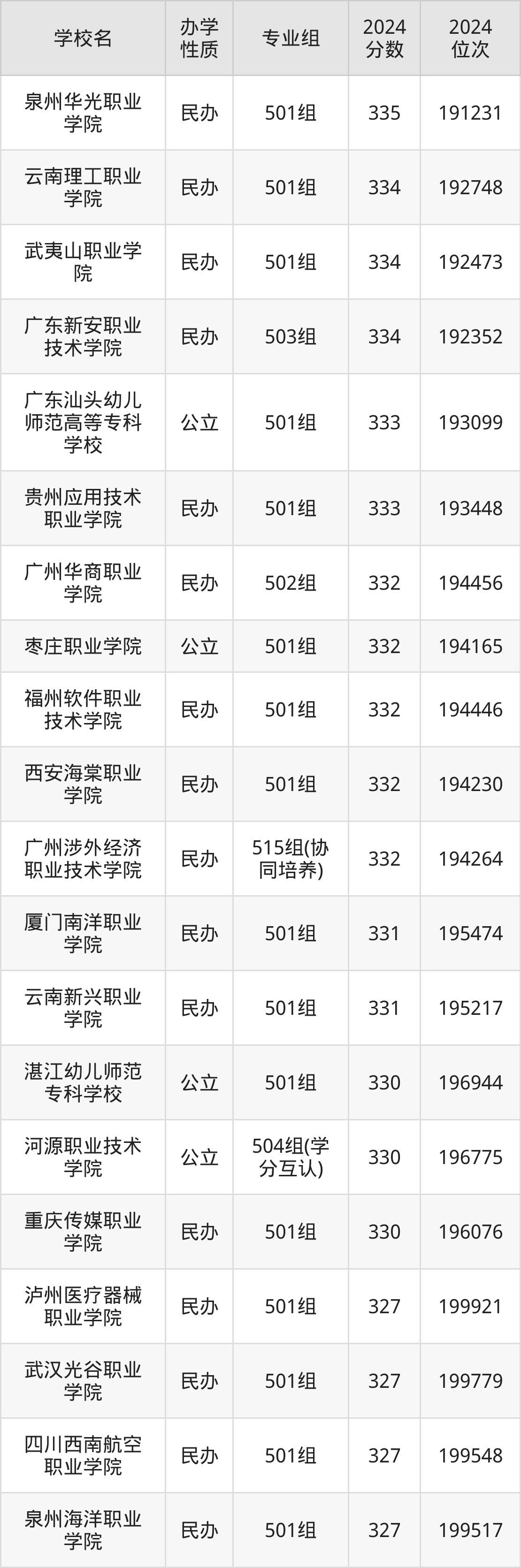 2024年广东历史类330分考生能上泉州华光职业学院、云南理工职业学院、武夷山职业学院、广东新安职业技术学院、广东汕头幼儿师范高等专科学校等30所专科院校,具体录取分数线及位次为: