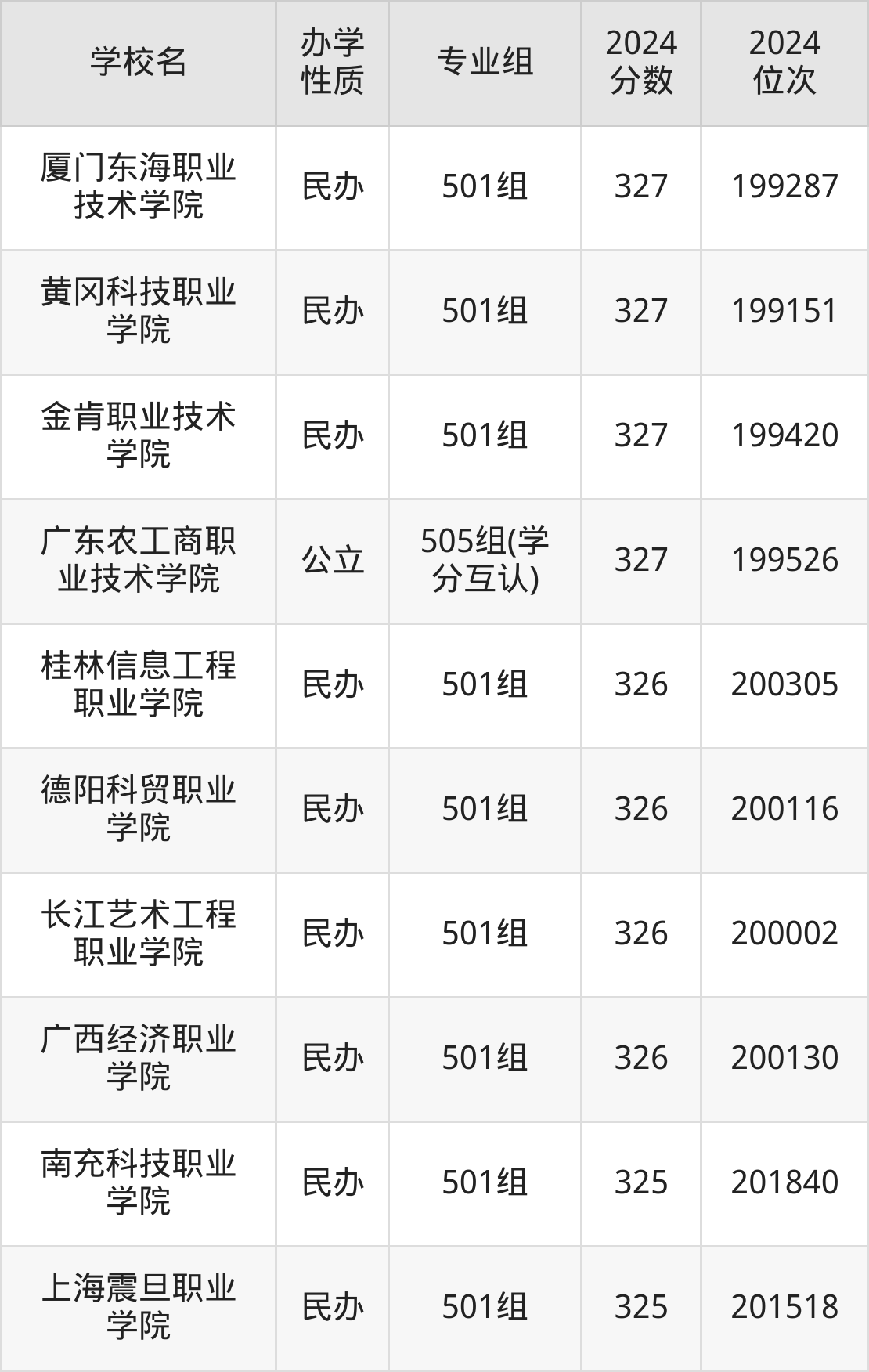 | 长江艺术工程 职业学院 | 501组 | 326 | 200002 |