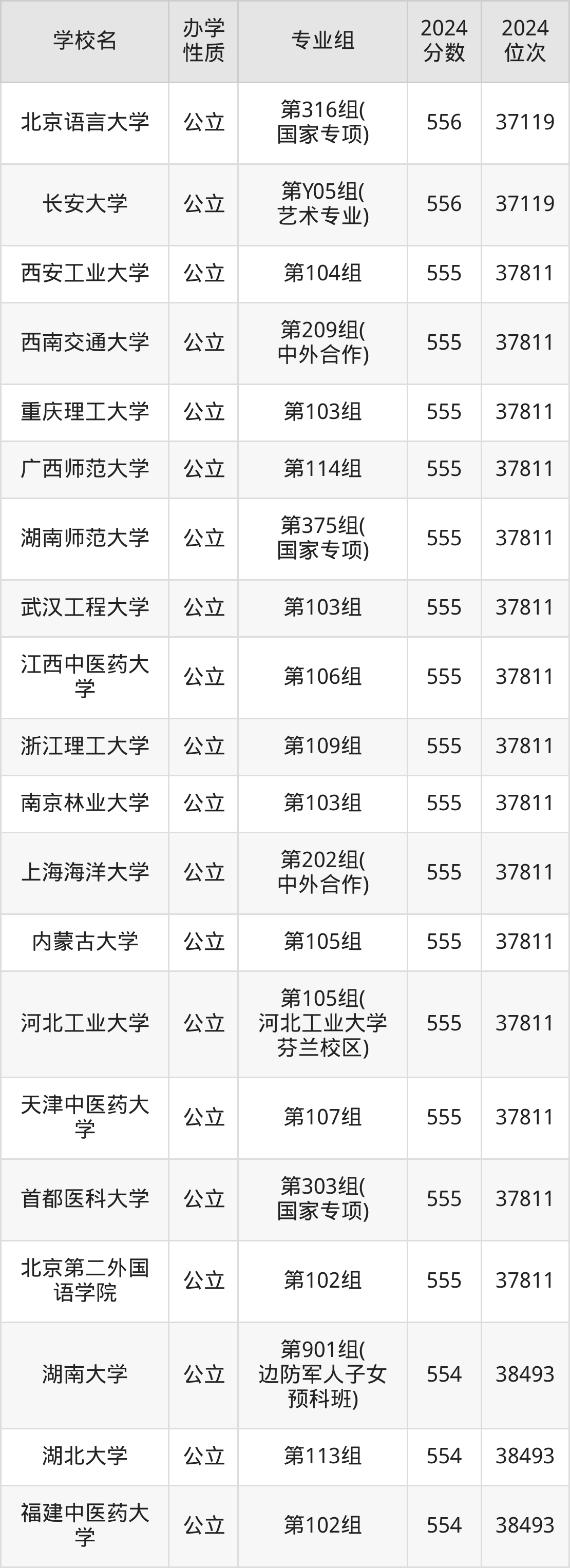2024年湖南物理类555分考生能上江南大学、石河子大学、陕西师范大学、西北大学、西南大学(荣昌校区)等23所211院校,具体录取分数线及位次为: