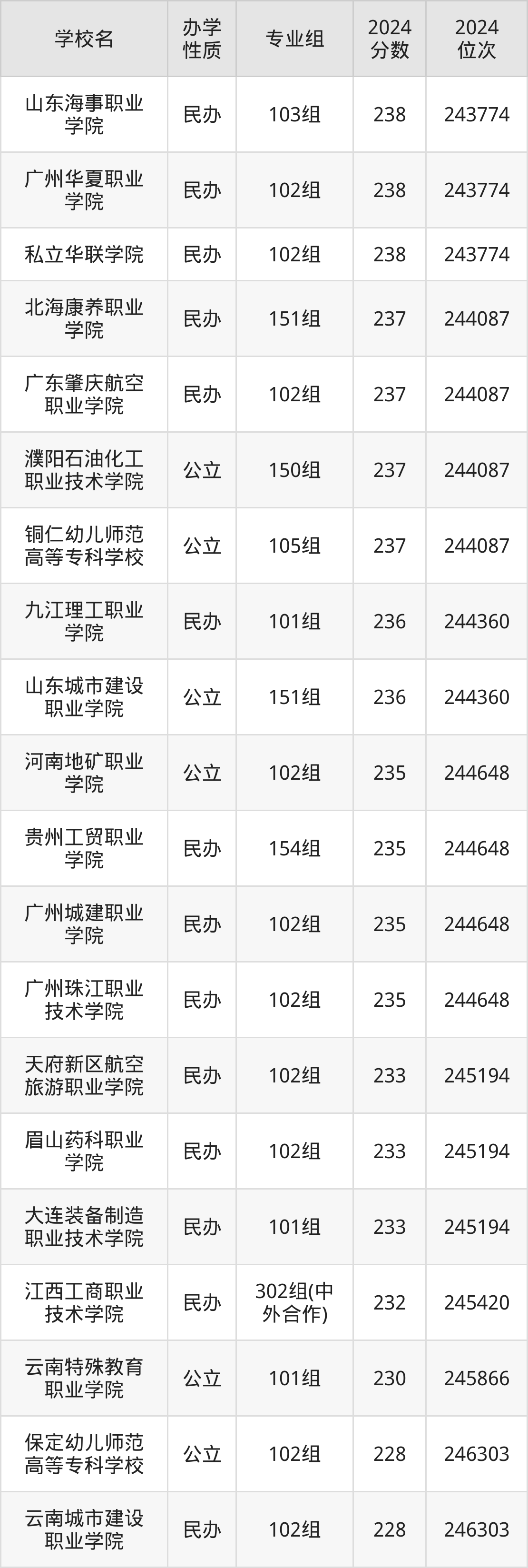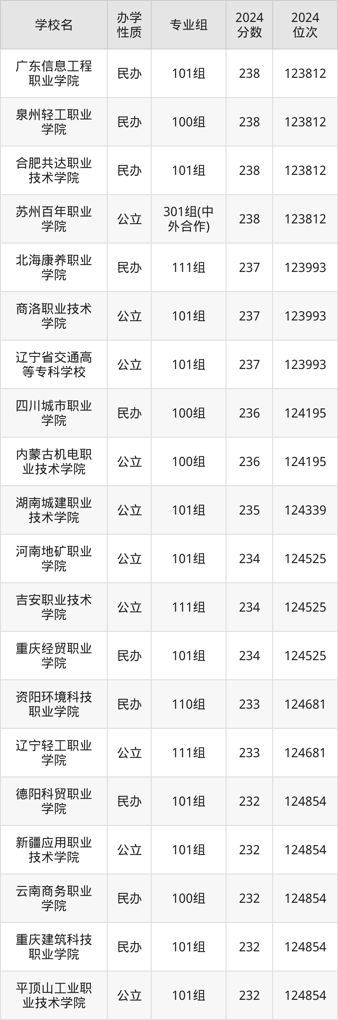 2024年广西历史类233分考生能上广东信息工程职业学院、泉州轻工职业学院、合肥共达职业技术学院、苏州百年职业学院、北海康养职业学院等27所专科院校,具体录取分数线及位次为: