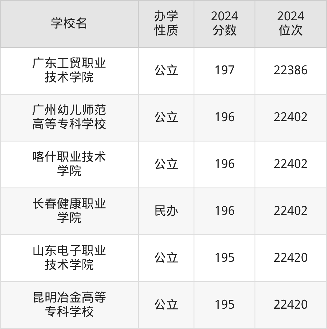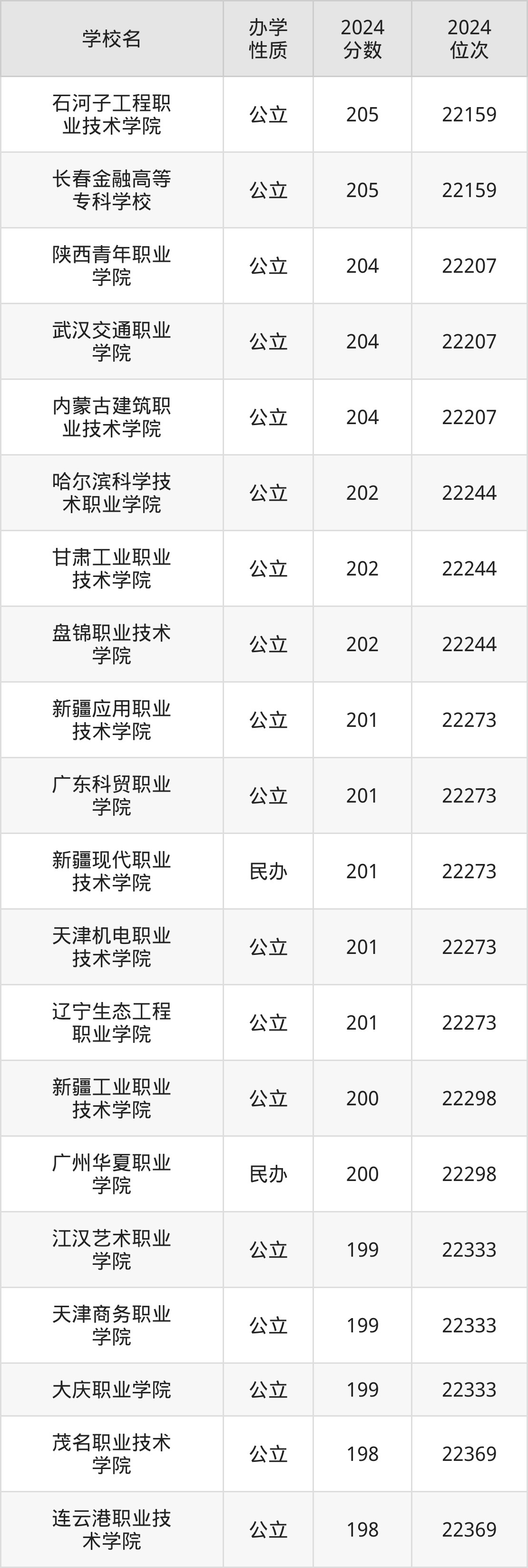 2024年新疆文科200分考生能上石河子工程职业技术学院、长春金融高等专科学校、陕西青年职业学院、武汉交通职业学院、内蒙古建筑职业技术学院等26所专科院校,具体录取分数线及位次为: