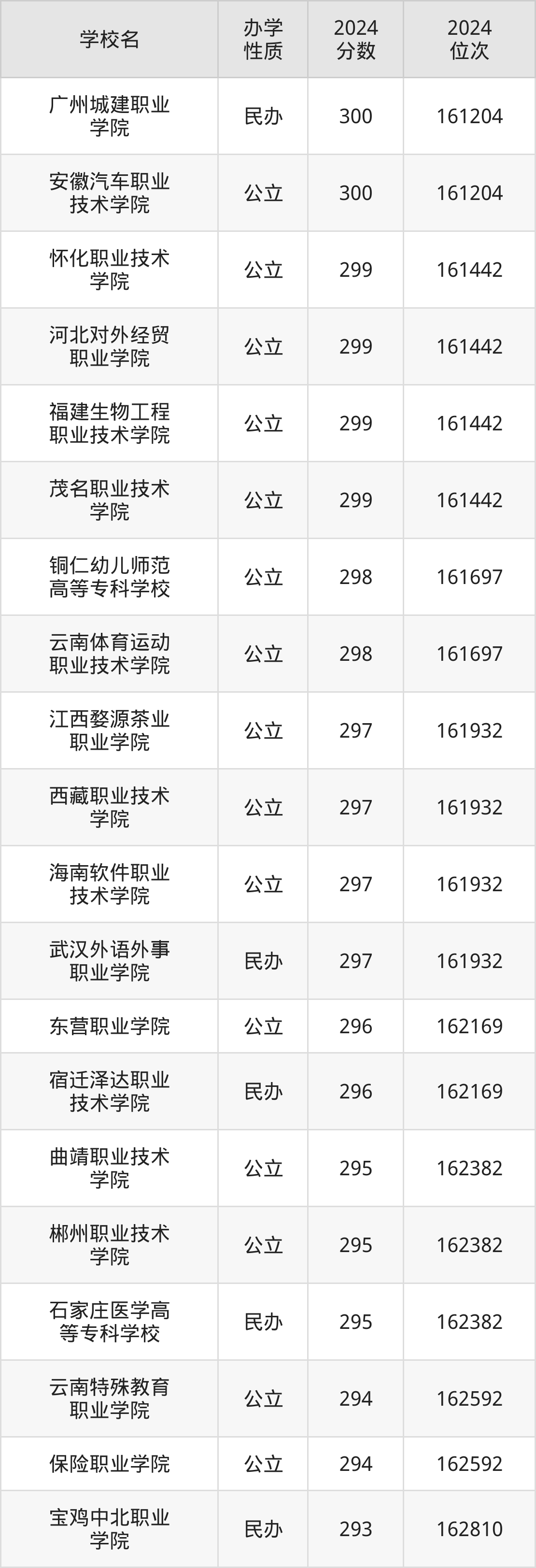 2024年云南理科295分考生能上广州城建职业学院、安徽汽车职业技术学院、怀化职业技术学院、河北对外经贸职业学院、福建生物工程职业技术学院等29所专科院校,具体录取分数线及位次为: