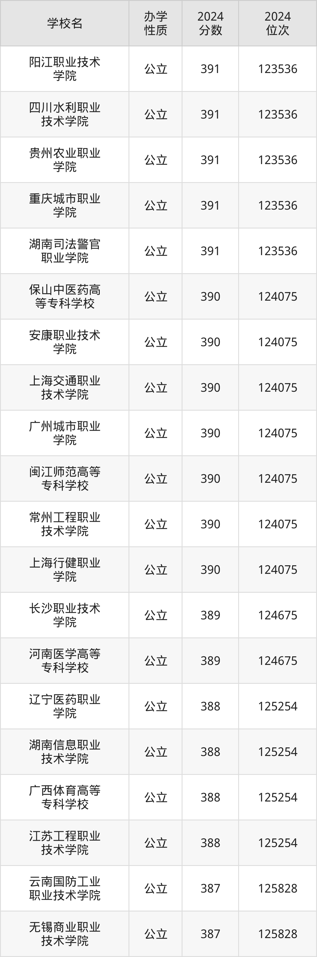 | 湖南司法警官 职业学院 | 391 | 123536 |